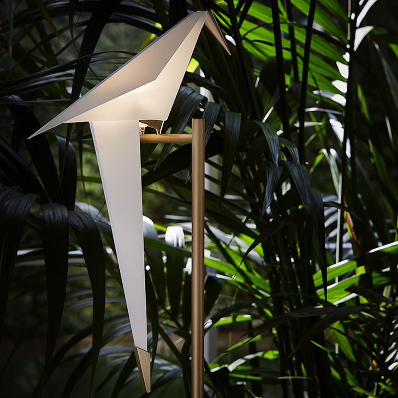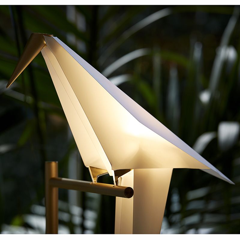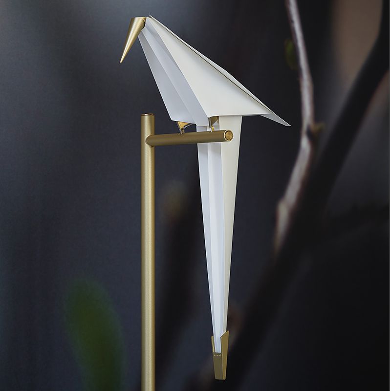折り紙のように折られた鳥は、くちばしと尾羽根の先端の真鍮色の金属がおもりとなっており、止まり木の上でゆらゆらとバランスを取りながらスイングします。