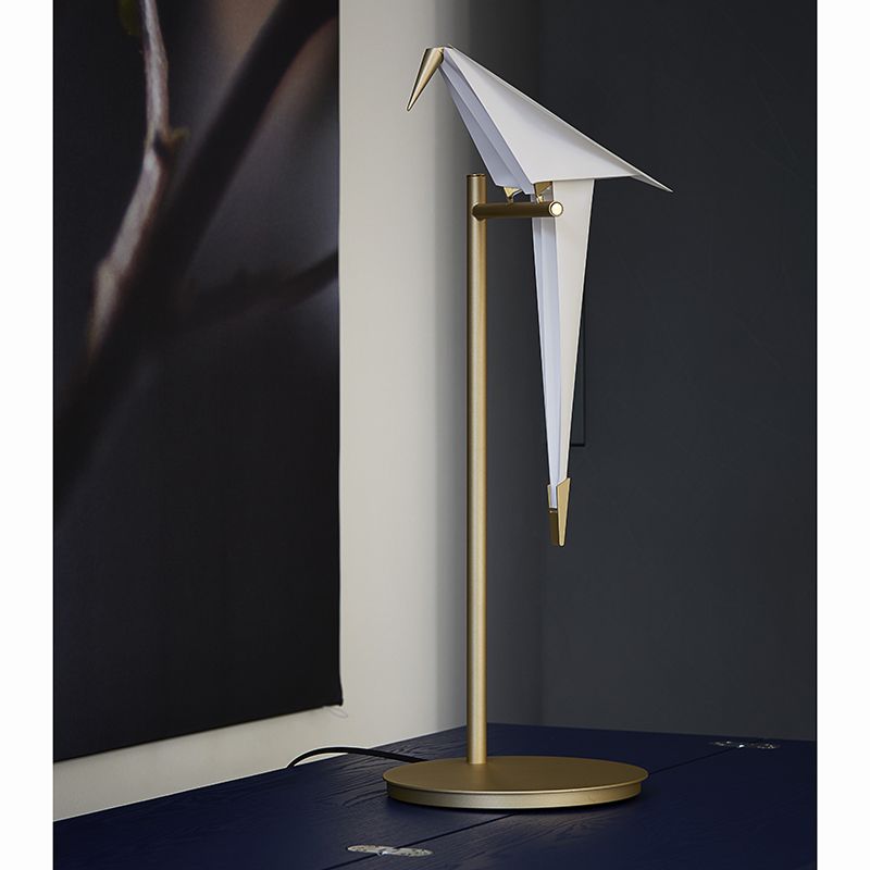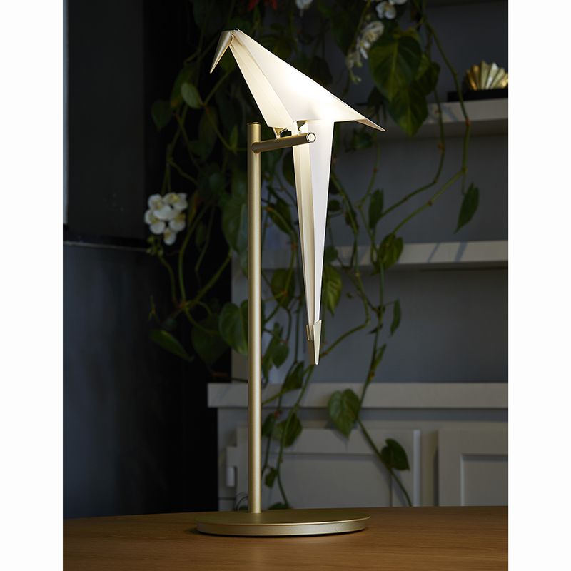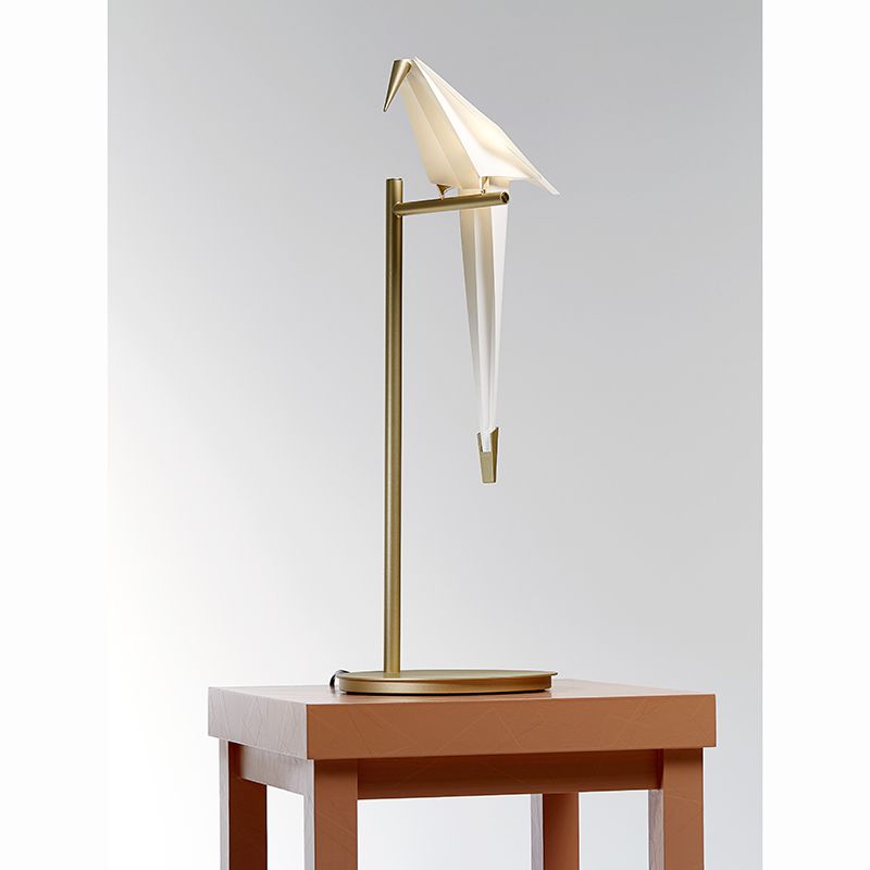 折り紙のように折られた鳥は、くちばしと尾羽根の先端の真鍮色の金属がおもりとなっており、止まり木の上でゆらゆらとバランスを取りながらスイングします。