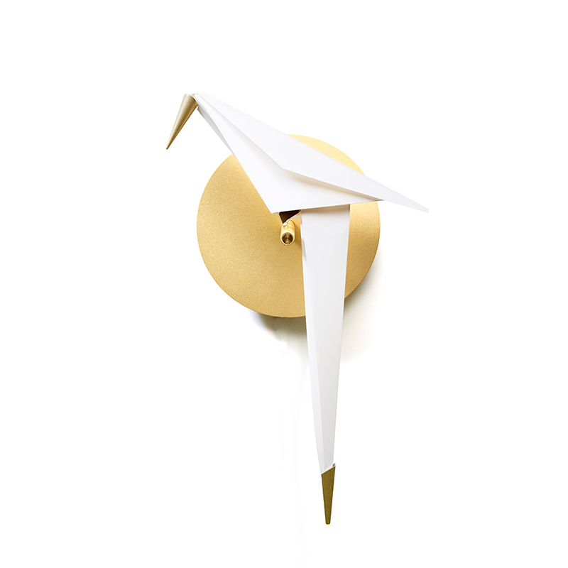 折り紙のように折られた鳥は、くちばしと尾羽根の先端の真鍮色の金属がおもりとなっており、止まり木の上でゆらゆらとバランスを取りながらスイングします。