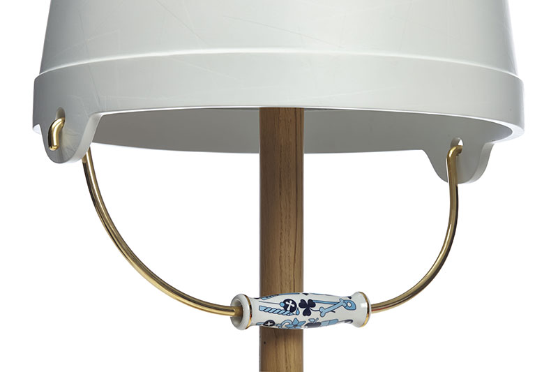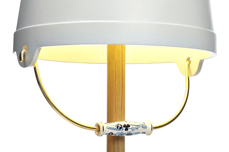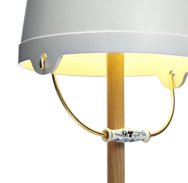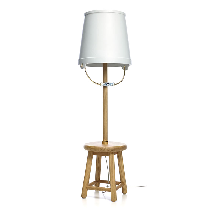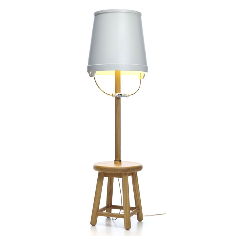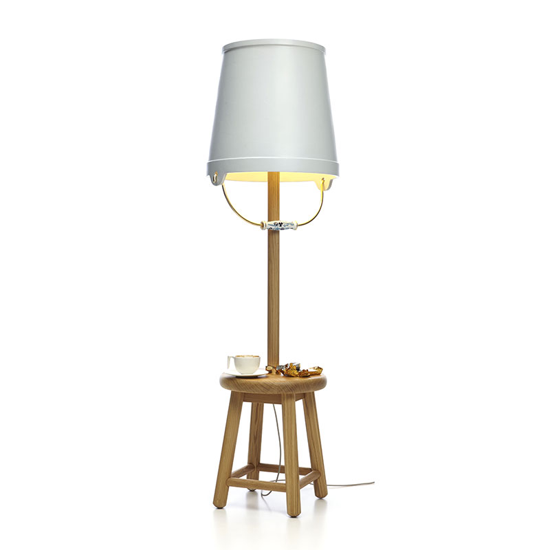 スタジオヨブがつくったこのフロア照明は、実用的に使えるバケツという道具をデザインとして使い、照明という機能的な道具にモノを置けるという実用性を加えました。