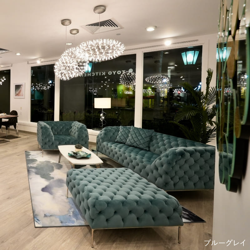 リズミカルにステッチ(タフティング加工)を施したクラシックなチェスターフィールド調のソファを、モダンにアレンジしたデザインです。