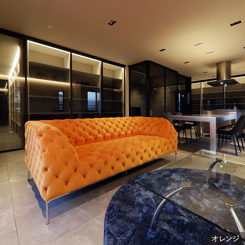 家族でゆったり使え、大人でも横になってリラックスできるサイズを確保しつつ、チェスターフィールドソファにありがちな、外側への張り出しはスッキリと削ぎ落としました。