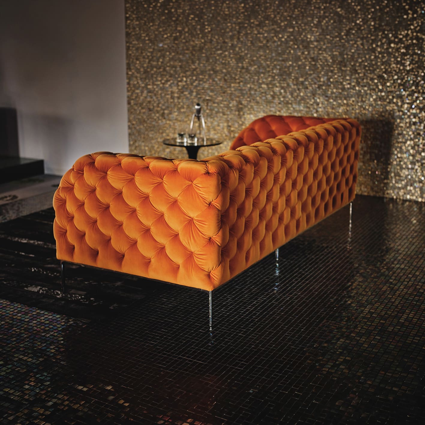 リズミカルにステッチ(タフティング加工)を施したクラシックなチェスターフィールド調のソファを、モダンにアレンジしたデザインです。