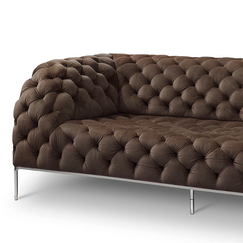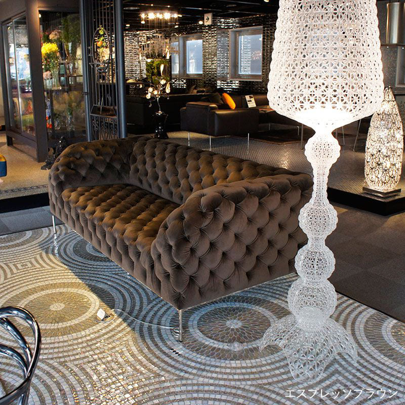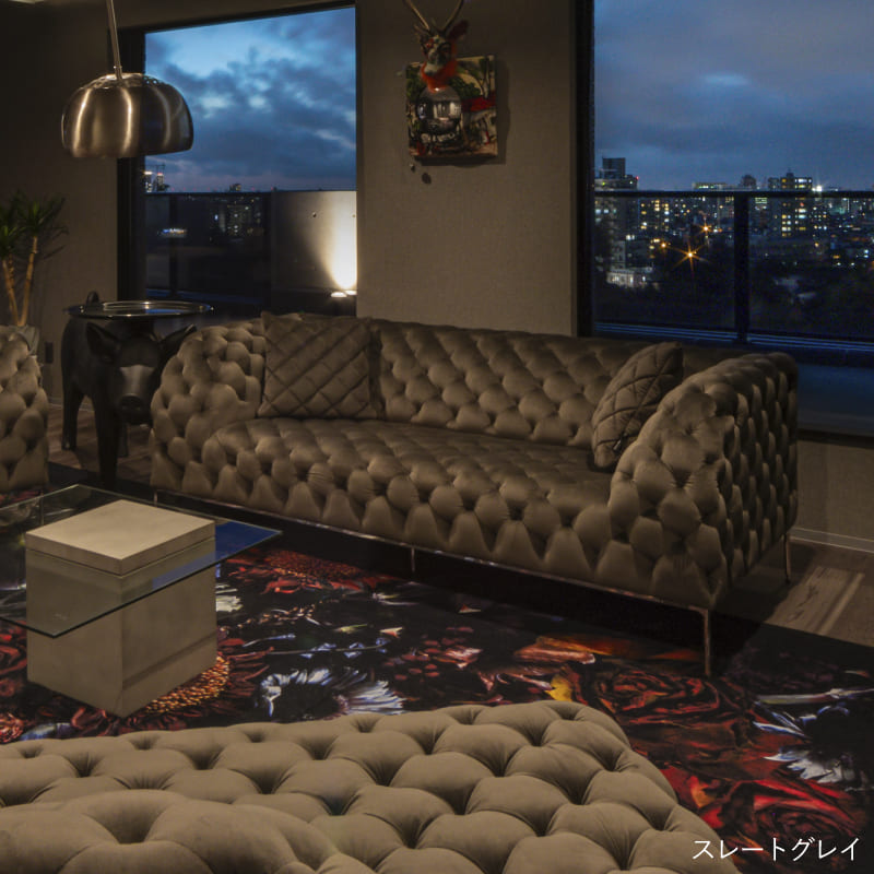 リズミカルにステッチ(タフティング加工)を施したクラシックなチェスターフィールド調のソファを、モダンにアレンジしたデザインです。