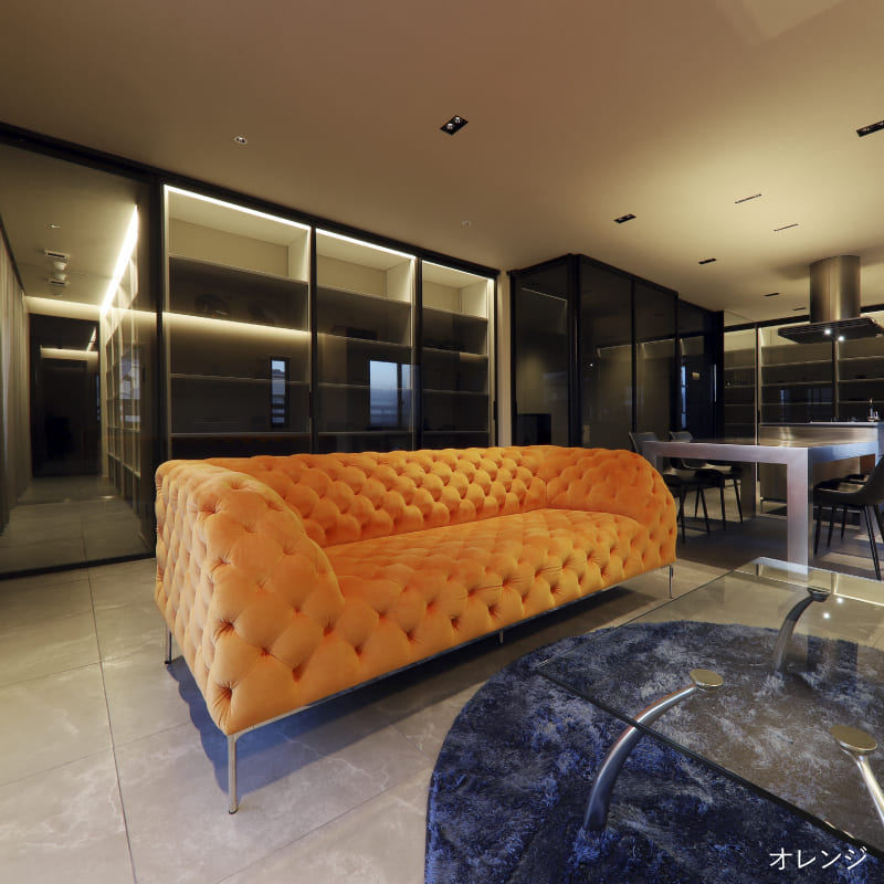 家族でゆったり使え、大人でも横になってリラックスできるサイズを確保しつつ、チェスターフィールドソファにありがちな、外側への張り出しはスッキリと削ぎ落としました。