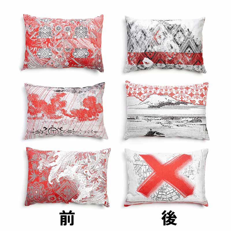 3つセットのクッションです。置いてあるだけでも様になる、日本画風のテイストや、現代美術のような前衛的なイラストもかっこいい。