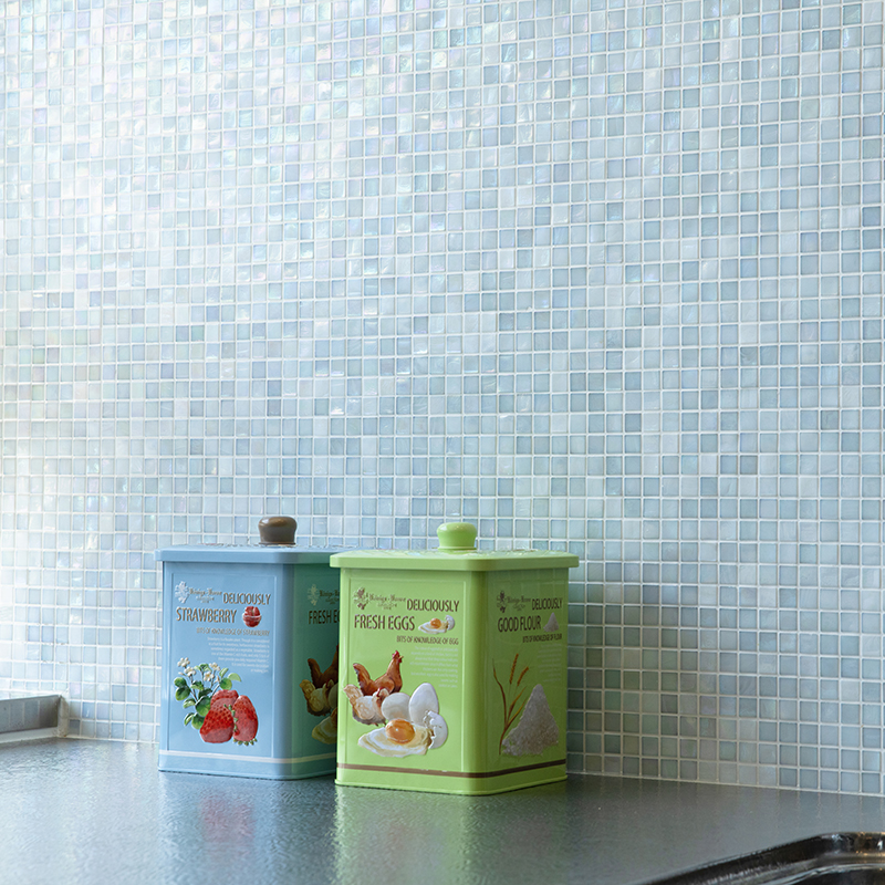 デイジーは七色に輝く加工を施した「イリジウム」という種類のヴェネツィアンモザイクタイルです。