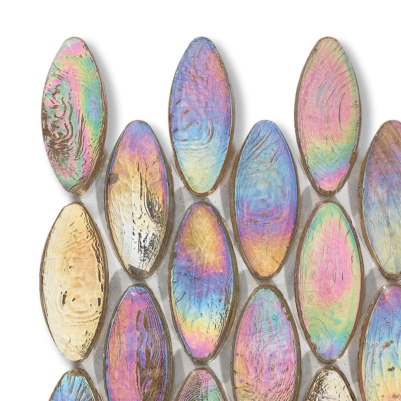 揮発性の高い鉱物を原料としているため、輝きや表情がピース1枚ごとに異なります。光が演出する虹色効果も特徴の1つです。