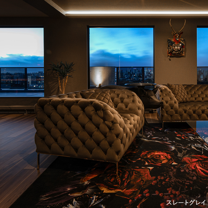 家族でゆったり使え、大人でも横になってリラックスできるサイズを確保しつつ、チェスターフィールドソファにありがちな、外側への張り出しはスッキリと削ぎ落としました。