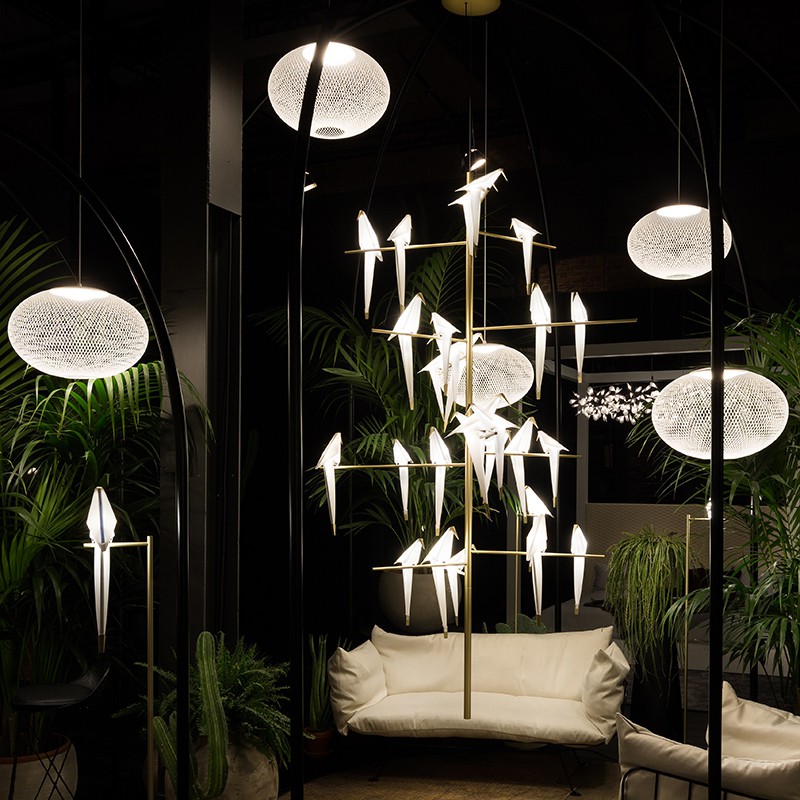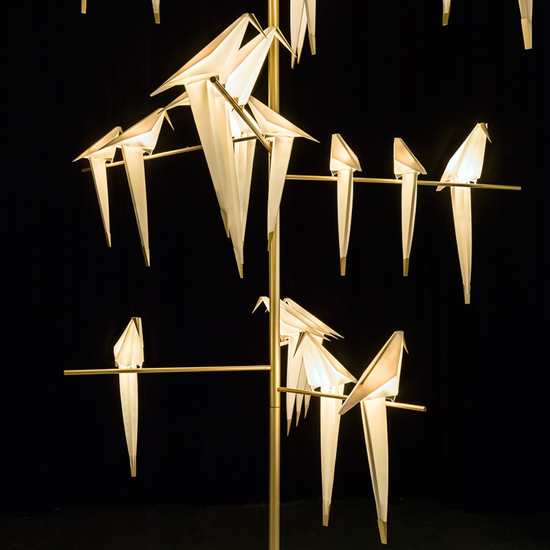止まり木に止まって、遊んだりさえずったりしている鳥たちがモチーフとなった照明シリーズ。詩的で優雅な姿が魅力的です。