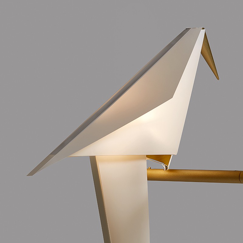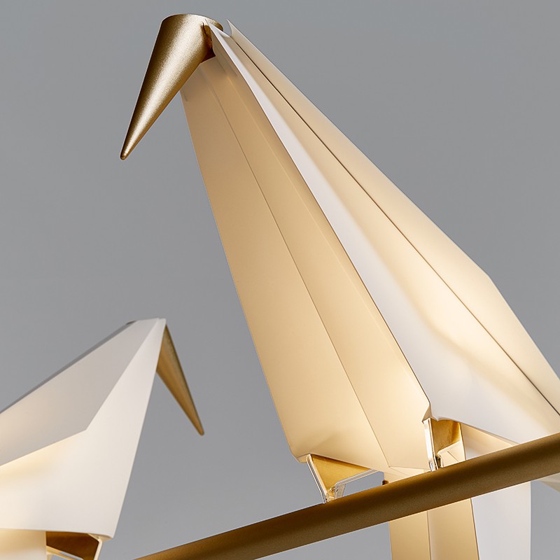 折り紙のように折られた鳥は、くちばしと尾羽根の先端の真鍮色の金属がおもりとなっており、止まり木の上でゆらゆらとバランスを取りながらスイングします。