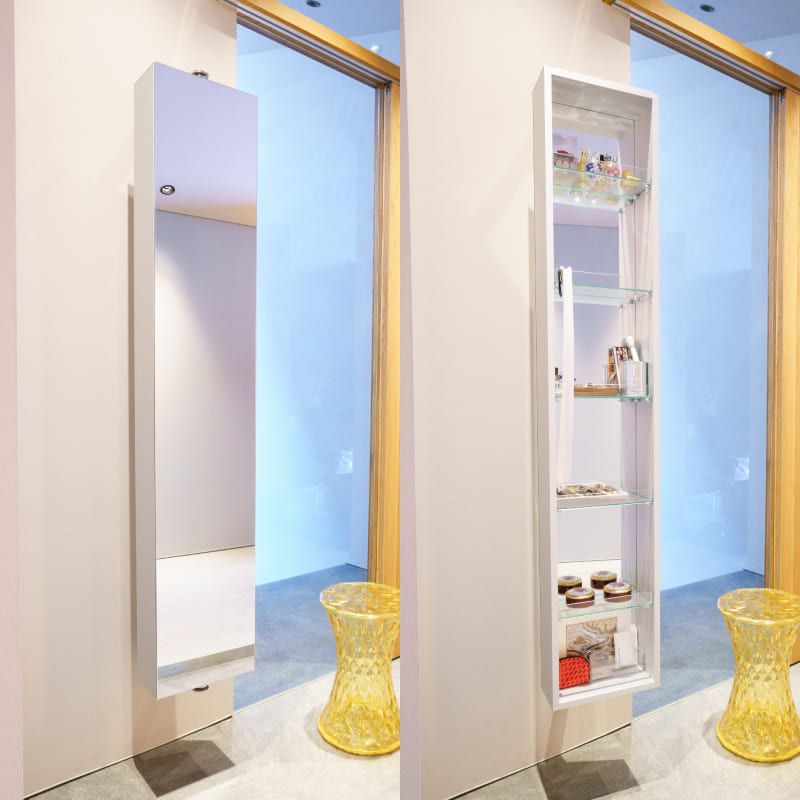 ミラーはスリムながらも高さサイズ充分の姿見として、くるりと回せば大容量の収納が現れます。