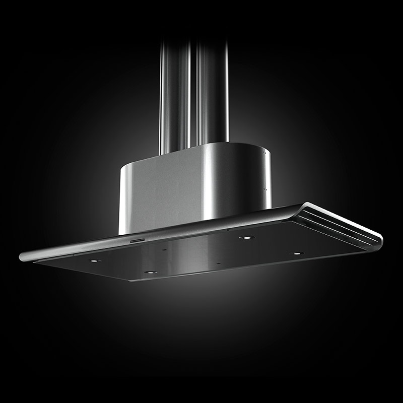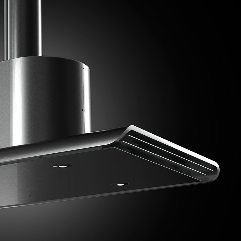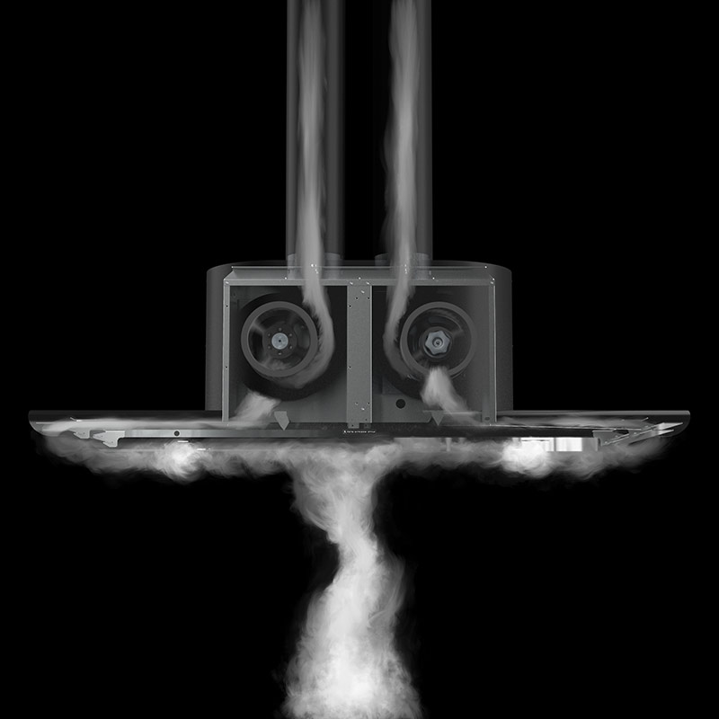 新開発のUFOが従来のレンジフードと異なるのは、サイドの3枚の羽です。4枚、5枚と羽を増やしたり、羽と羽の間の隙間サイズを変えてみたり、社内実験を何度も何度も繰り返し、もっとも煙を吸込む最適なサイドウィングを発見しました。それが、UFO独自の3枚の羽です。 上に行くほど広く伸びるウィング構造は、上に登ろうとする煙を段階的に捕集していきます。