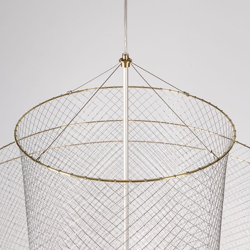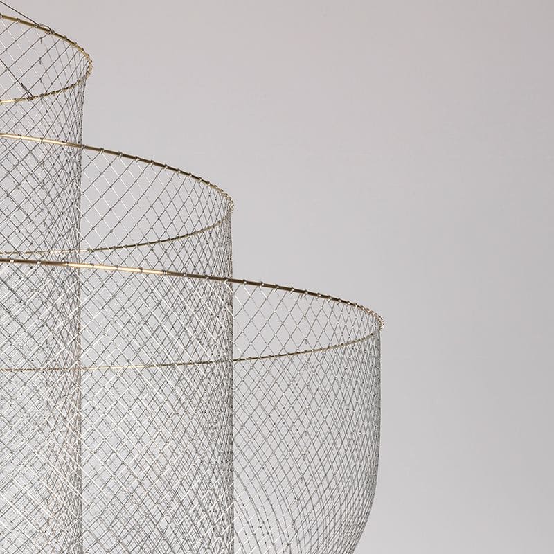 放射状に広がるワイヤーメッシュが、アイデンティティでもある照明全体のフォルムを構成しています。きめは細かく、レイヤーすることで視覚的なモアレ効果も生み出すエレガントなマテリアルです。