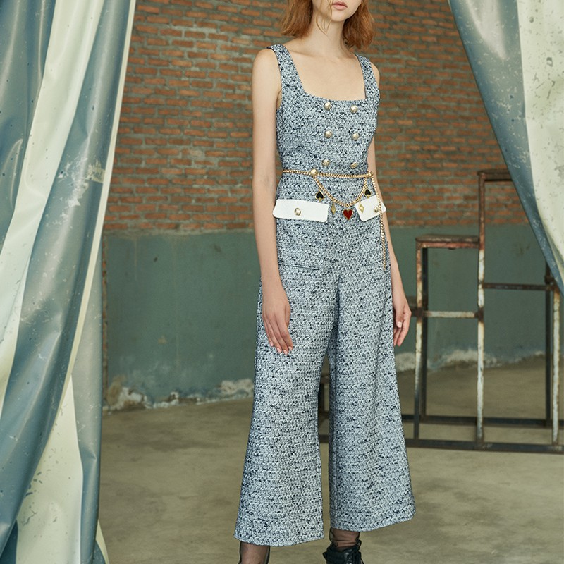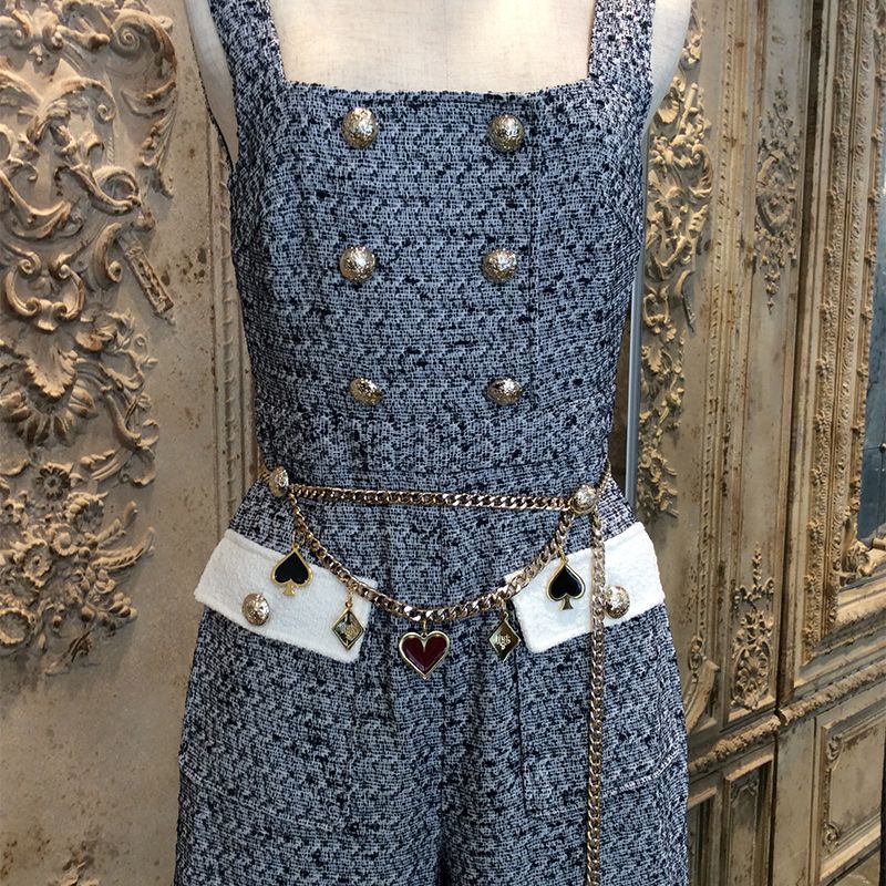 Classic Tweed Jumpsuit with Detachable Card Suites Charms Belt