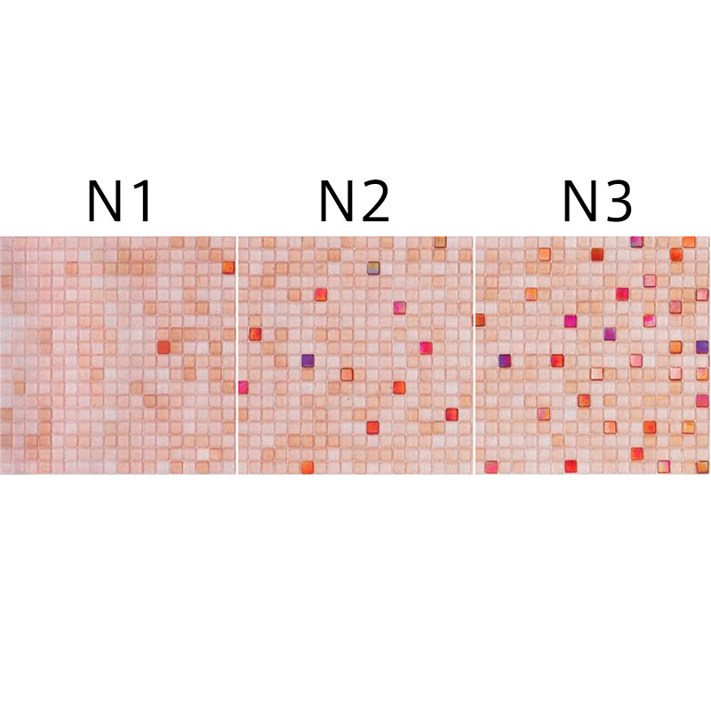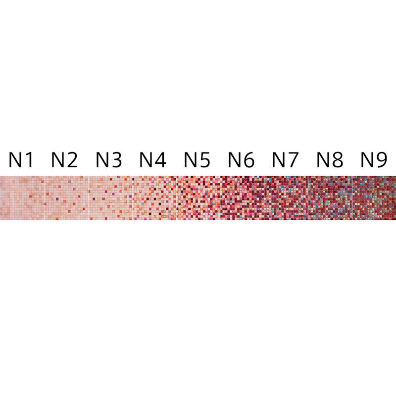 壁面に動きのある彩りを与えます。9枚で完成する美しいグラデーションパターンです。枚数を調整することで、様々な広さに対応します。
