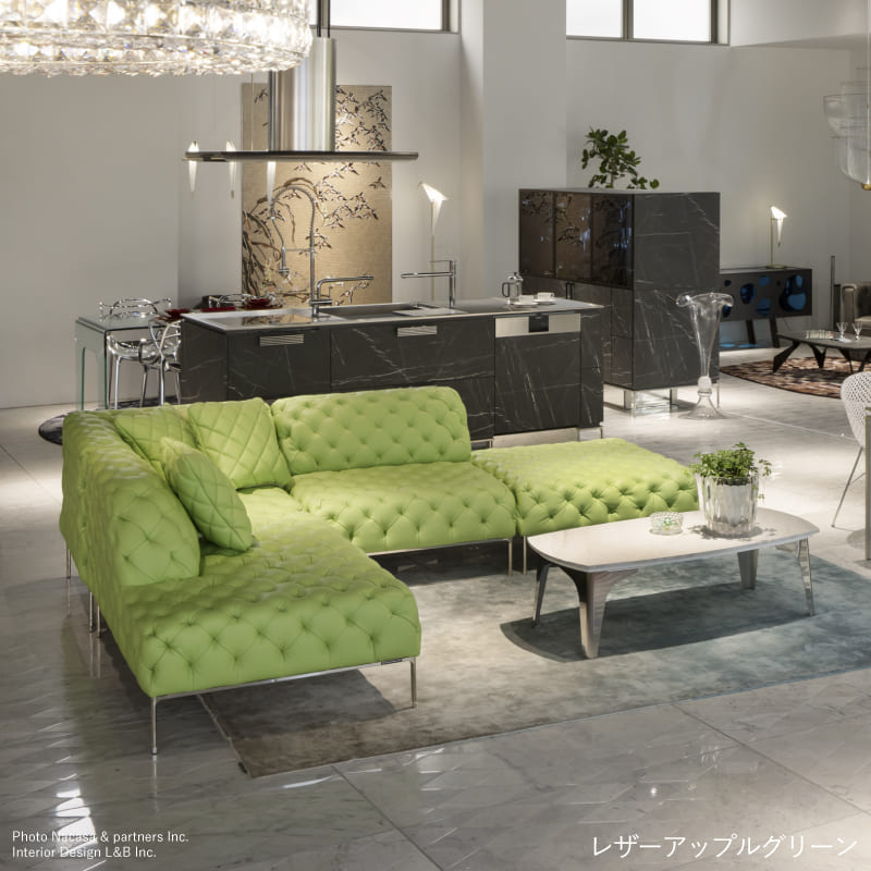 リズミカルにステッチ(タフティング加工)を施したクラシックなチェスターフィールド調のソファを、モダンにアレンジしたデザインです。