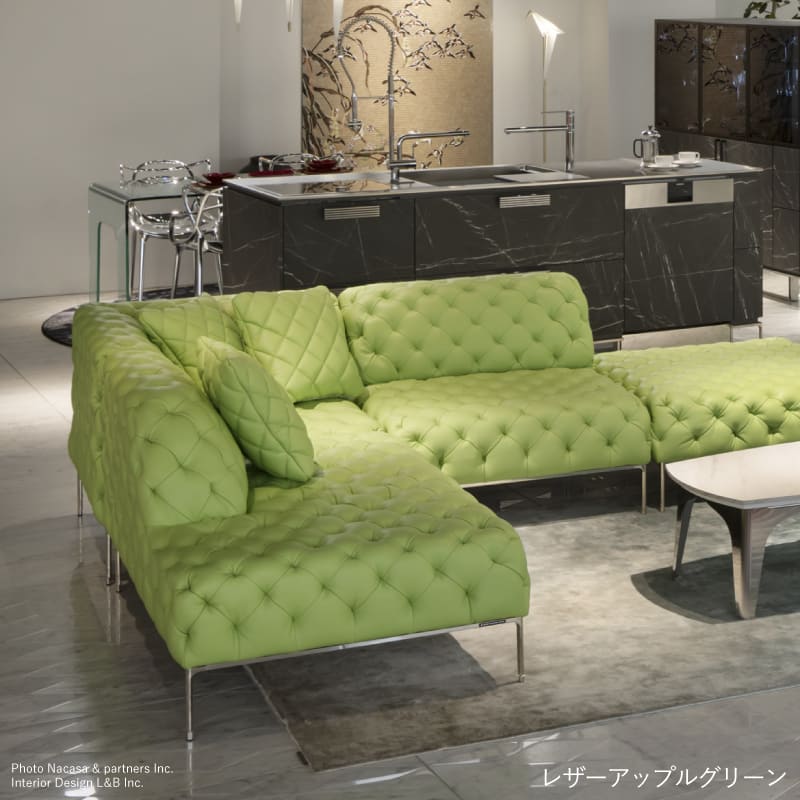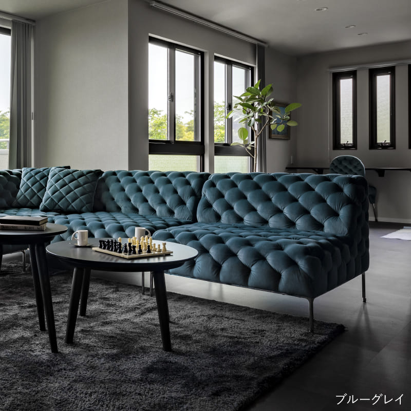 リズミカルにステッチ(タフティング加工)を施したクラシックなチェスターフィールド調のソファを、モダンにアレンジしたデザインです。