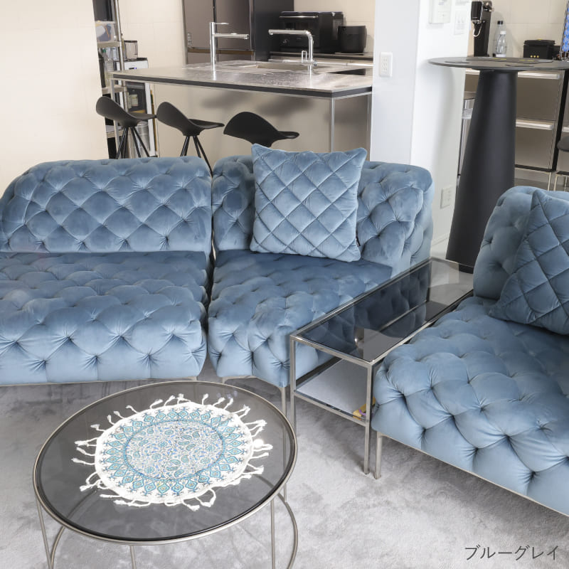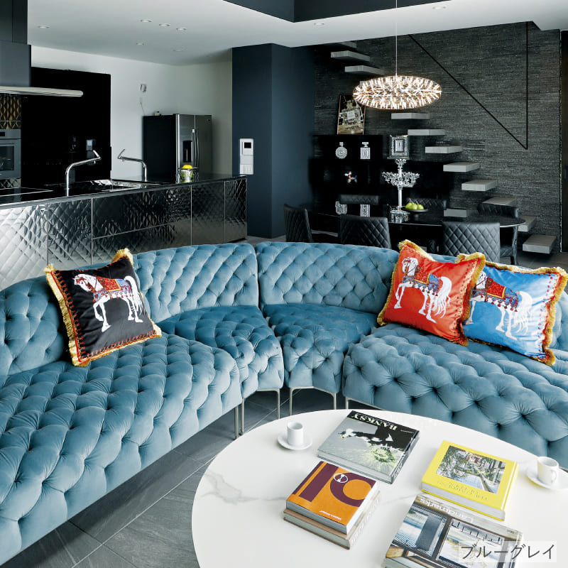 リズミカルにステッチ(タフティング加工)を施したクラシックなチェスターフィールド調のソファを、モダンにアレンジしたデザインです。