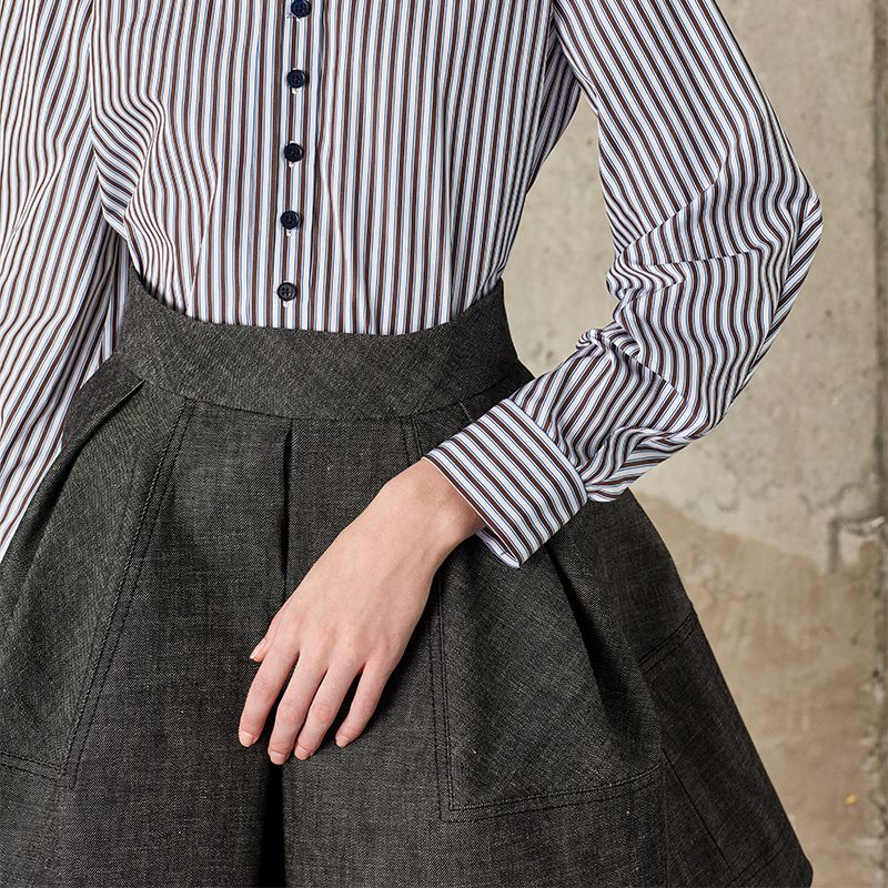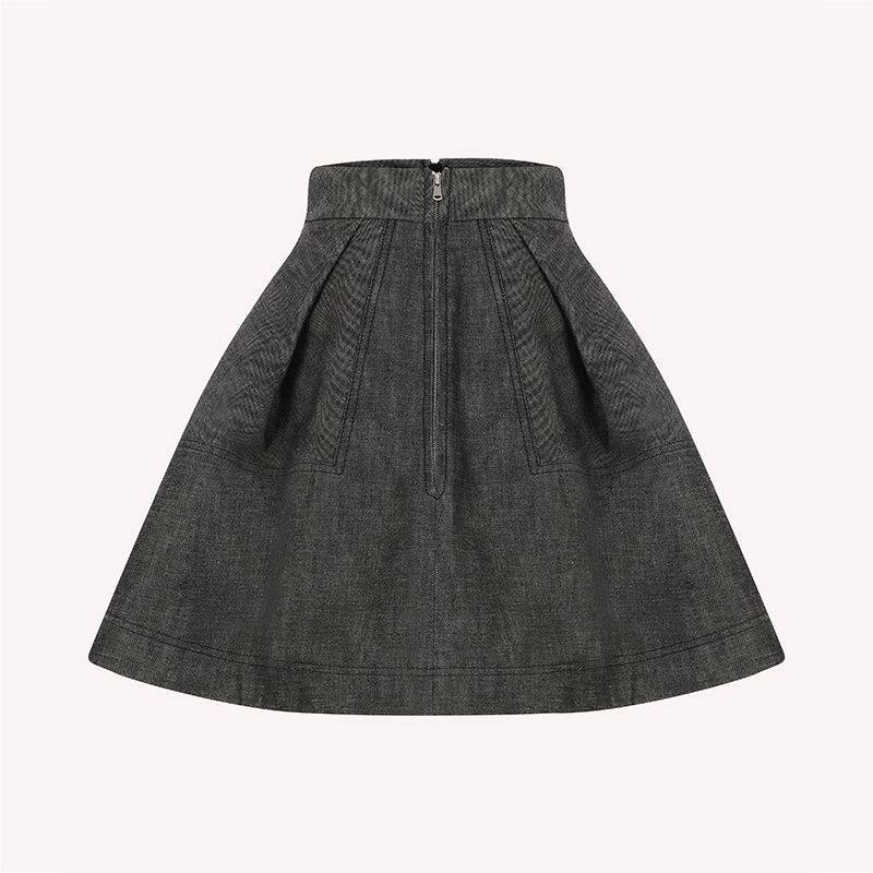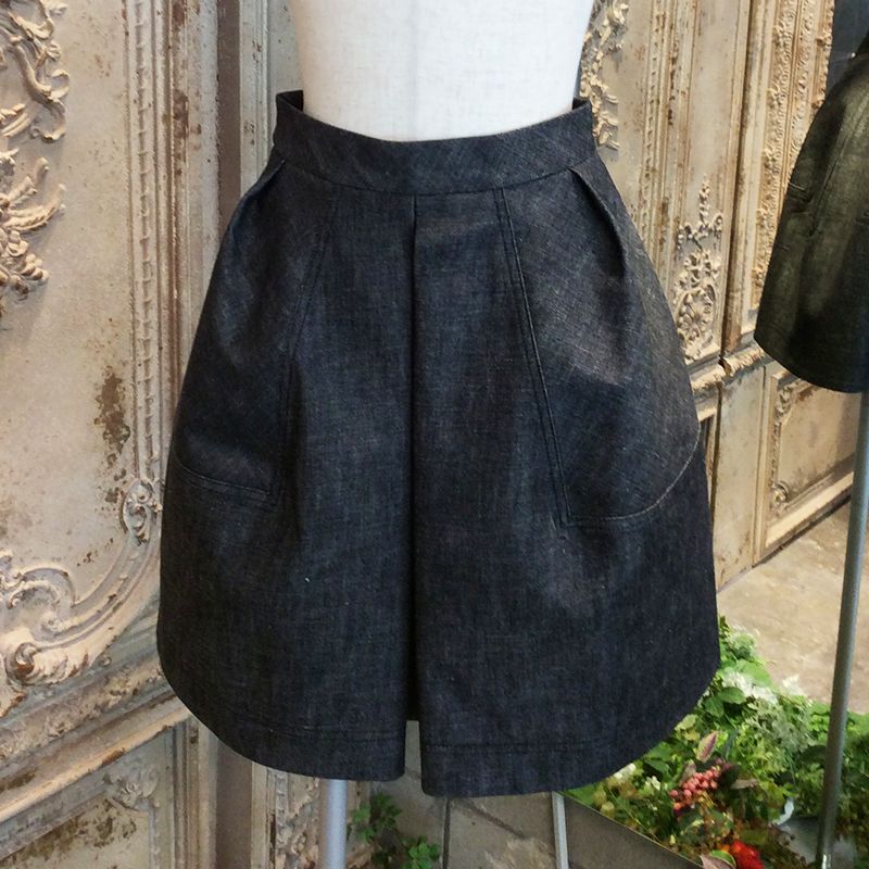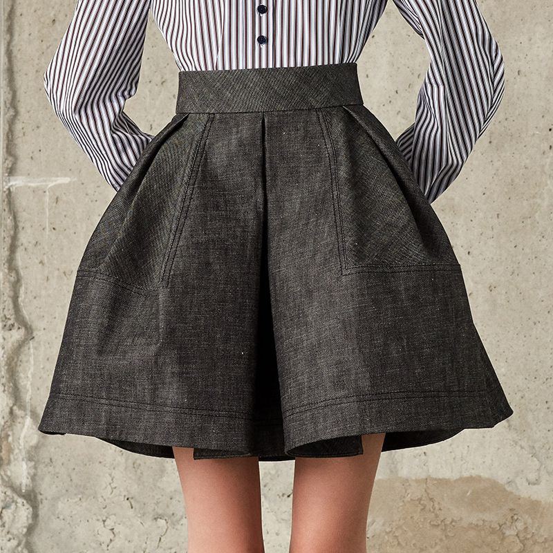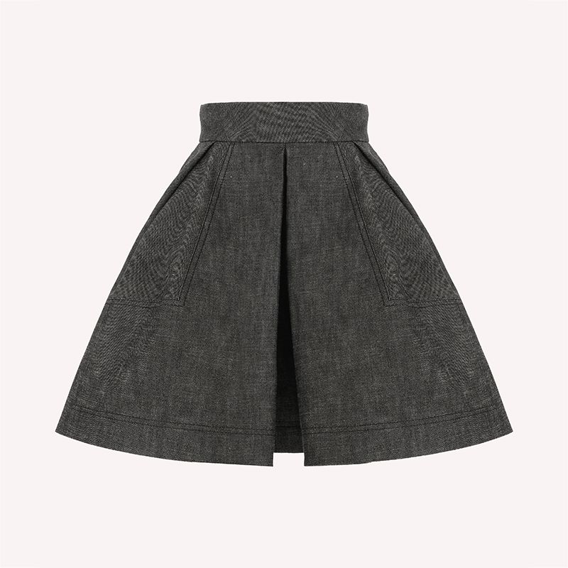この構築的なスカートは、生成り色のウォッシュ加工を施した、パリッとした構造のデニムで作られています。 ぴったりとしたウエストから、1つのボックスプリーツで形成されたベル型のスカートへと広がり、サイドには見えないシームポケットが付いています。