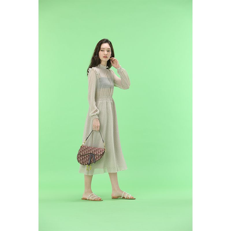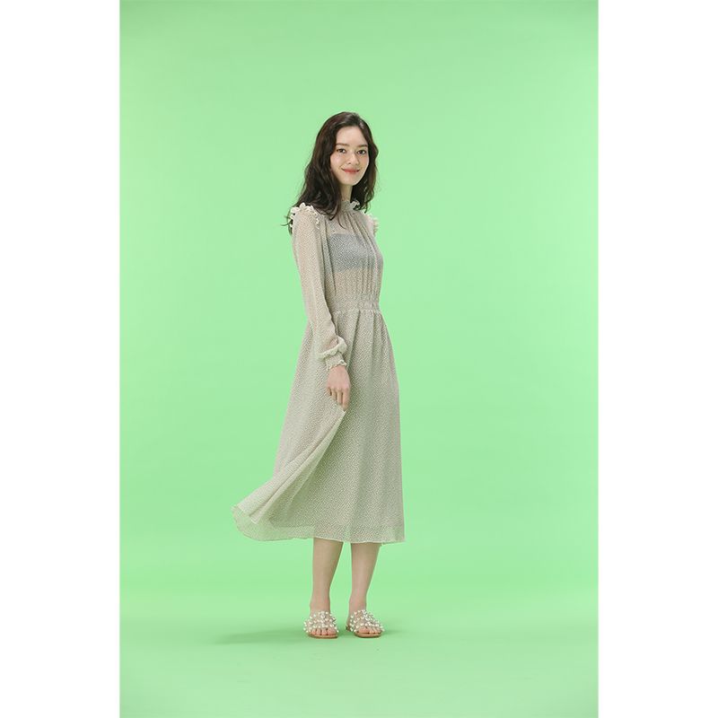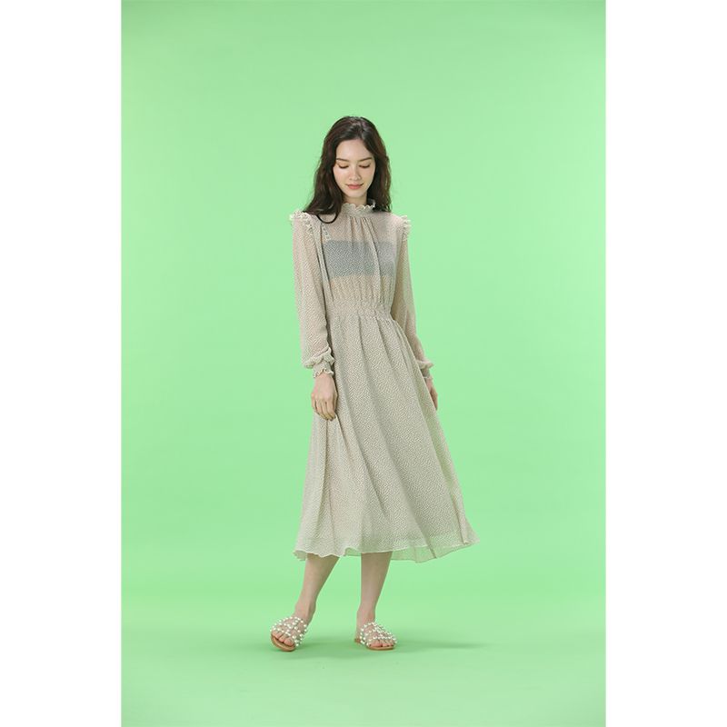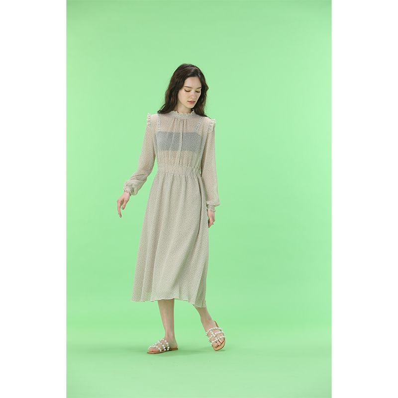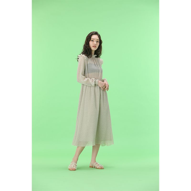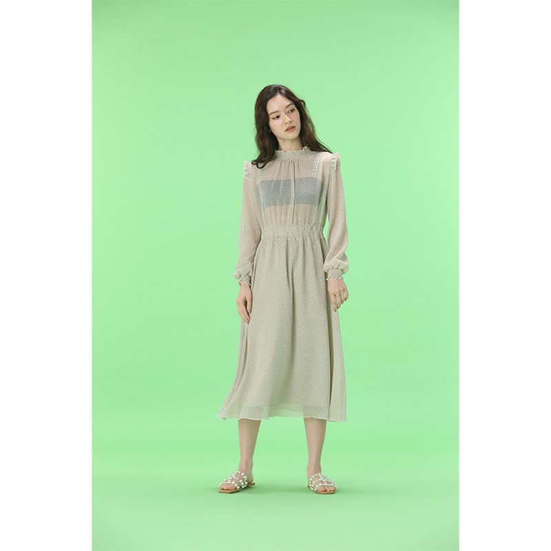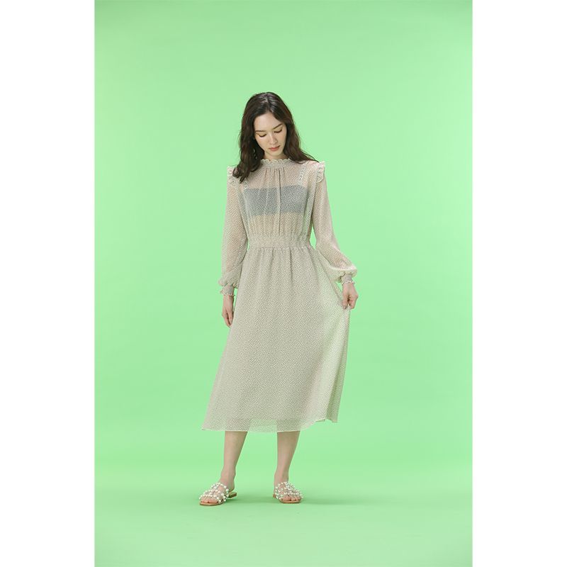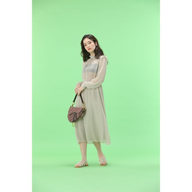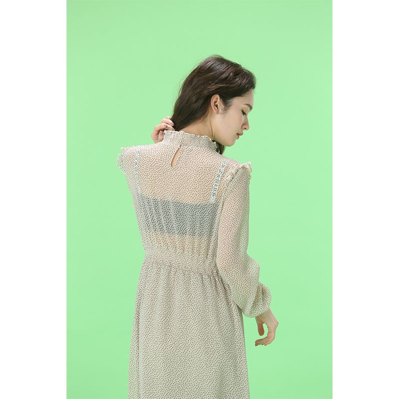 透け感のあるドットワンピース。ウエストと袖口はゴムになっており、スタイルアップして見せてくれながらも、リラックスした着心地です。