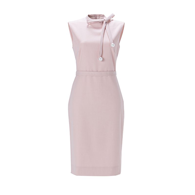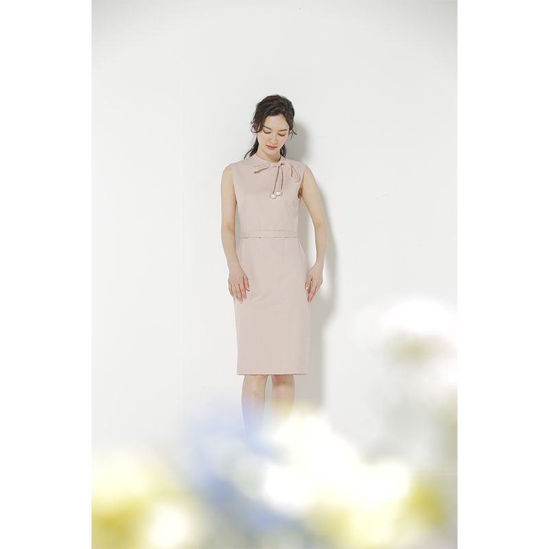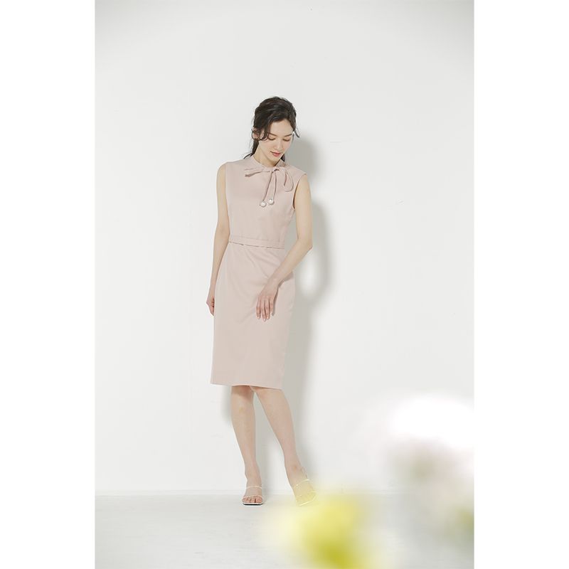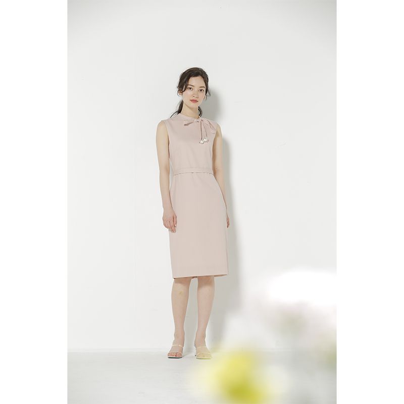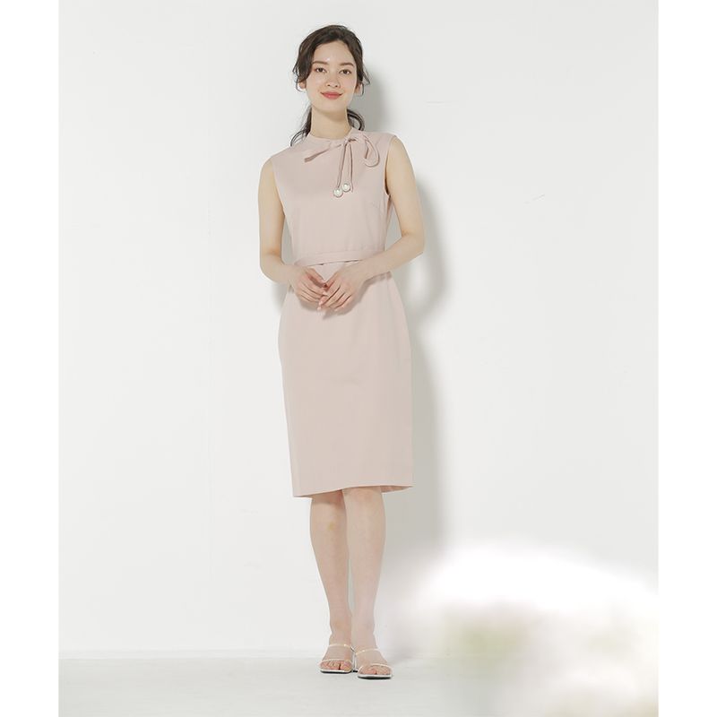 襟元のリボンと、揺れるパールがで上品な華やかさをプラスしたワンピース。