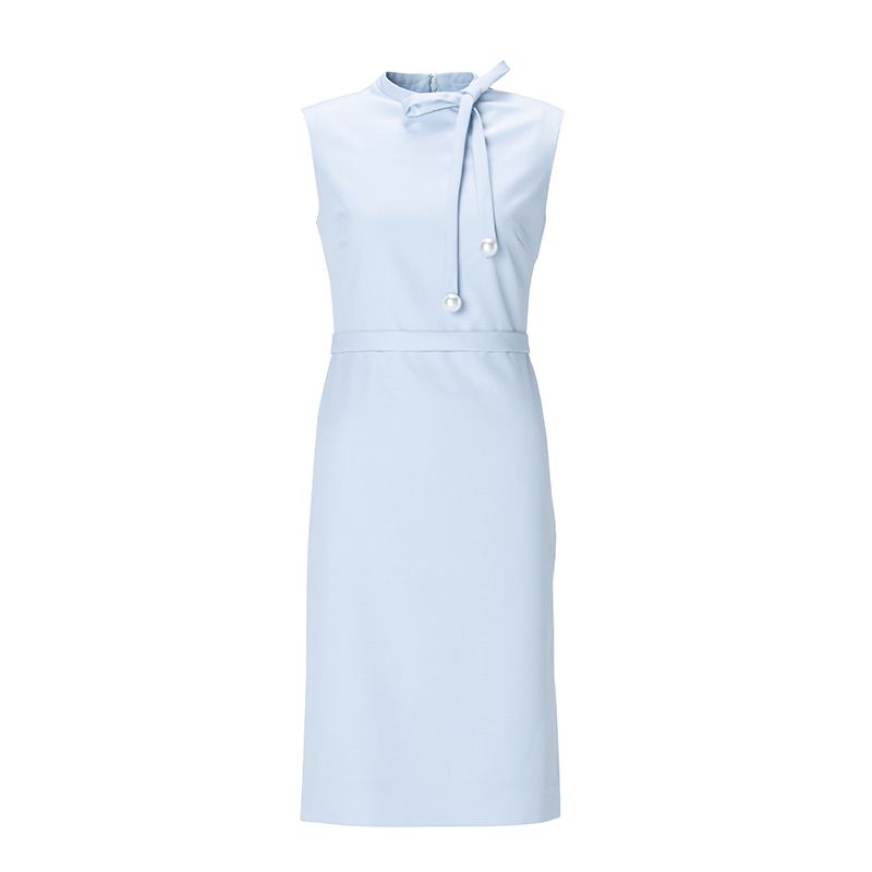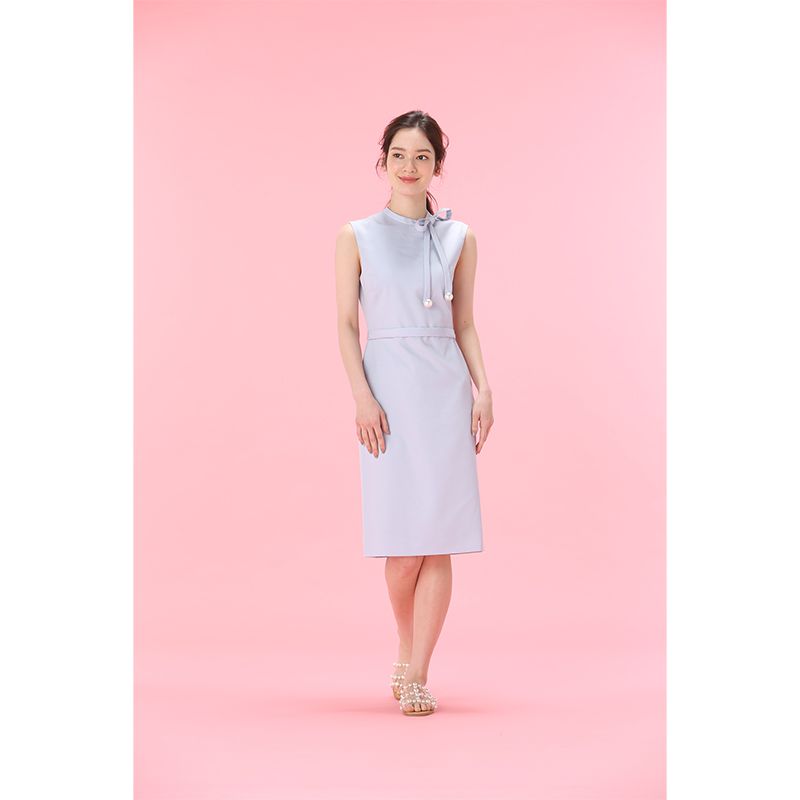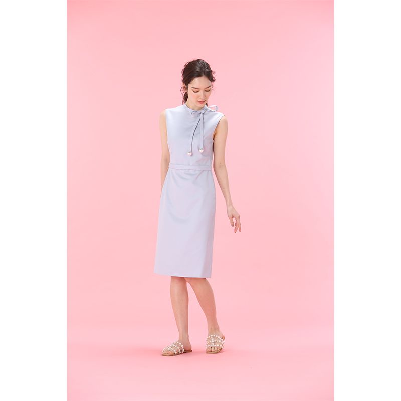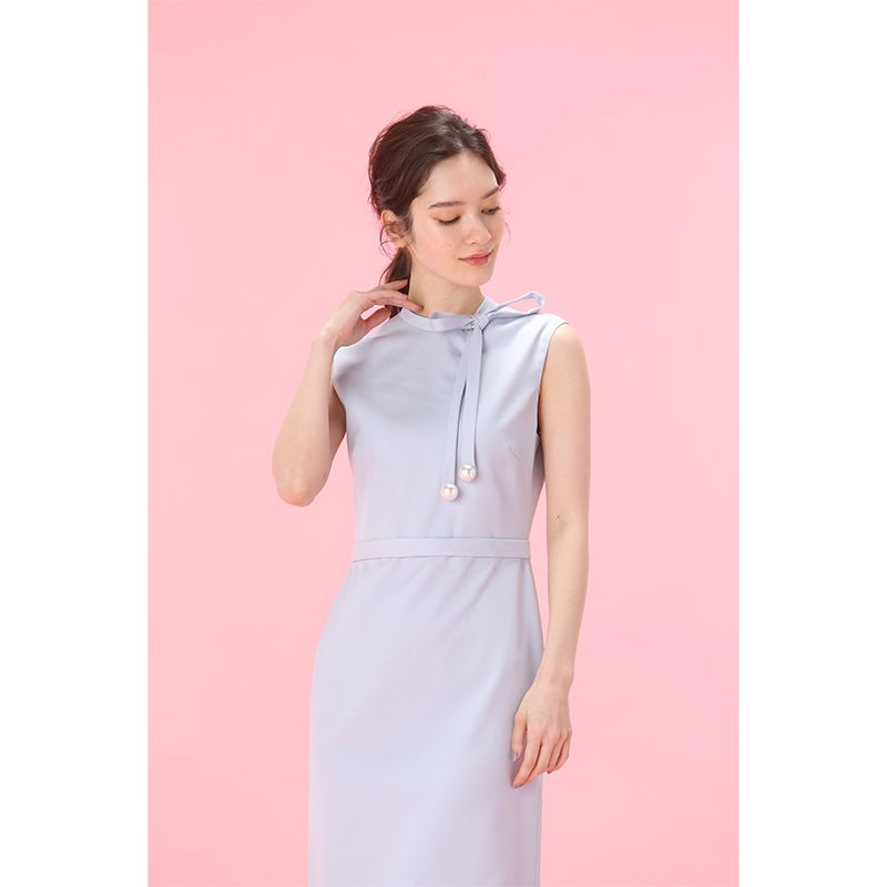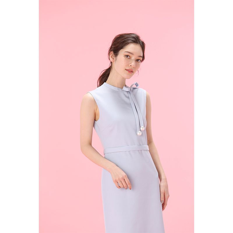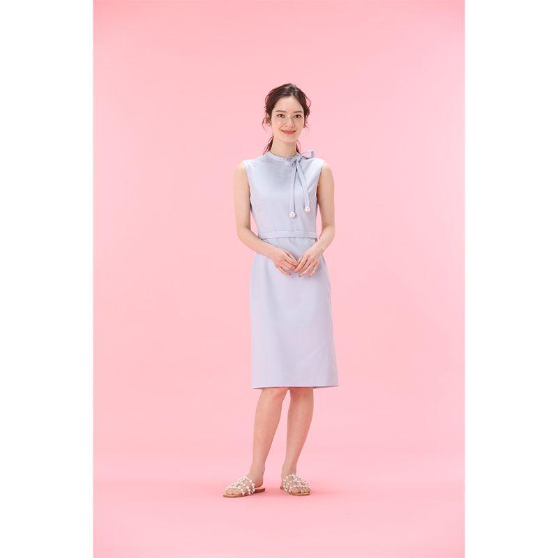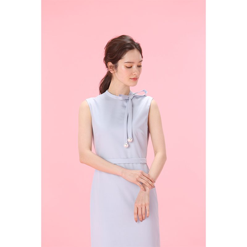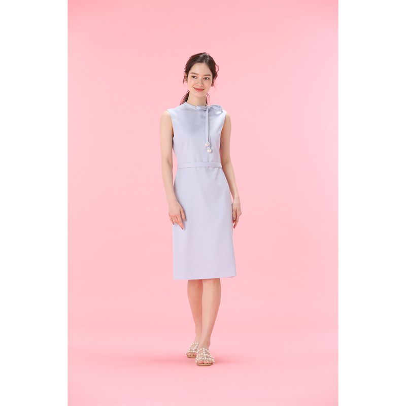 襟元のリボンと、揺れるパールがで上品な華やかさをプラスしたワンピース。