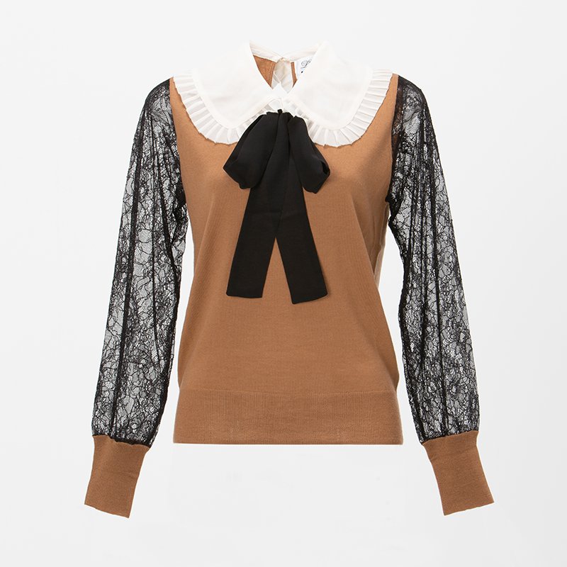 滑らかな触り心地のニットに、大きめの襟、袖のレース、胸元のリボンで女性らしさを演出します。