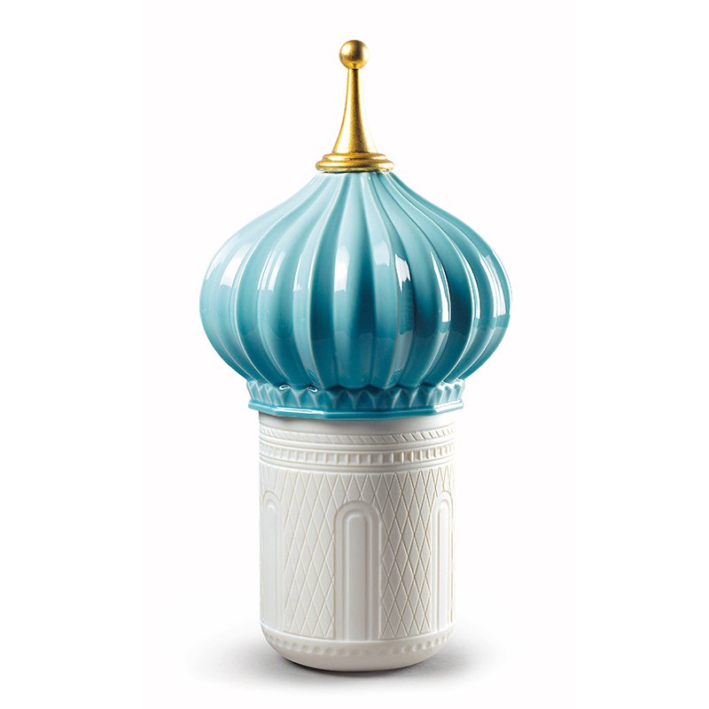 蓋は様々な青色(夢の色)のバリエーションを持つエナメル仕上げ。先端は金色に輝やき、ベース部分は透光性の磁器を用い、美しいレリーフが施されています。