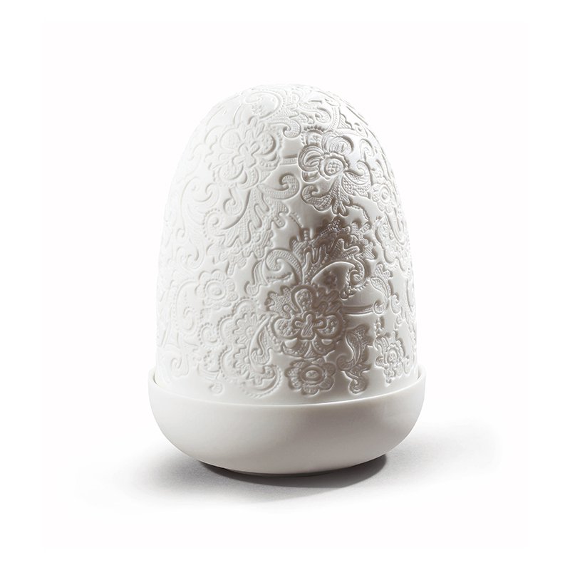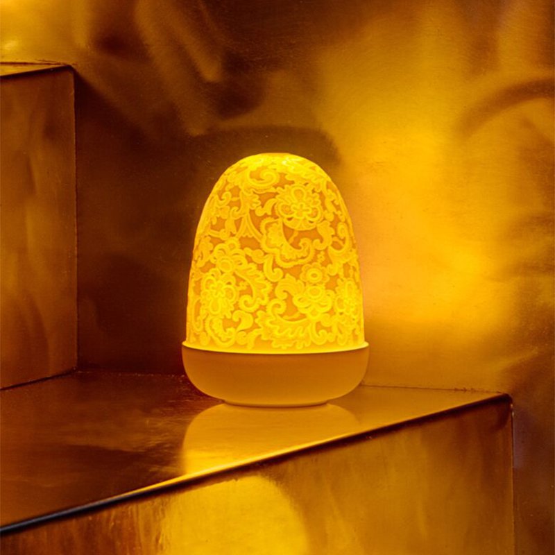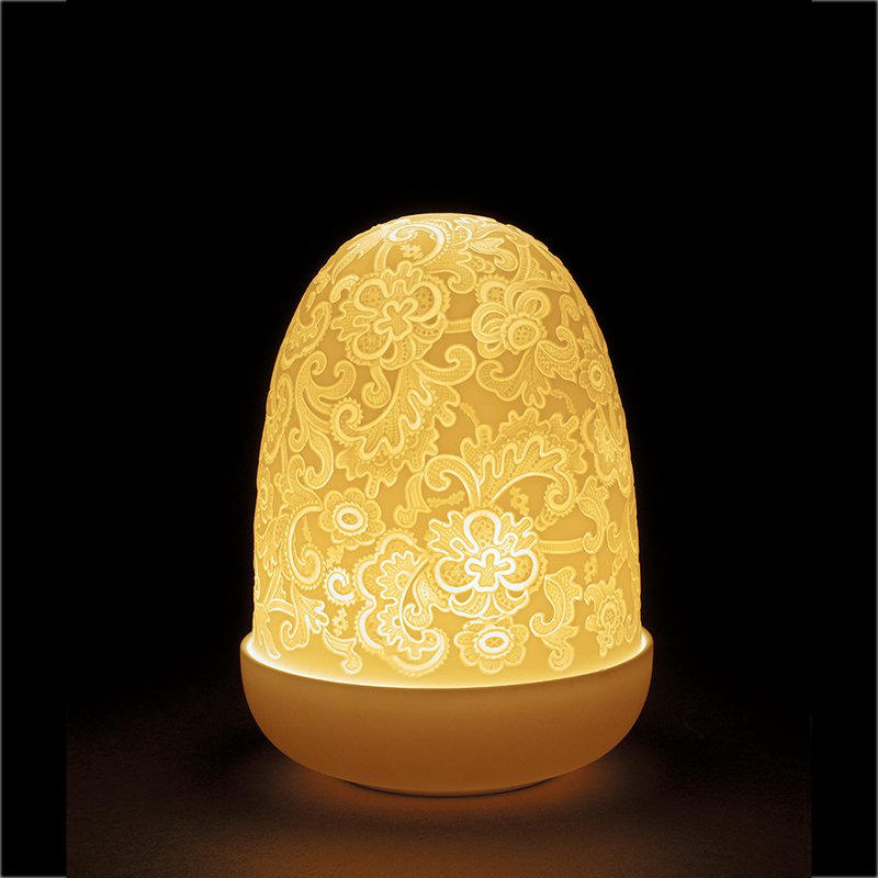 つやのないポーセリンで仕上げられており、透け感のある大きなドームの形をしたシェードをかぶせたテーブルランプは明かりをつけると、描かれた柄が浮かび上がります。