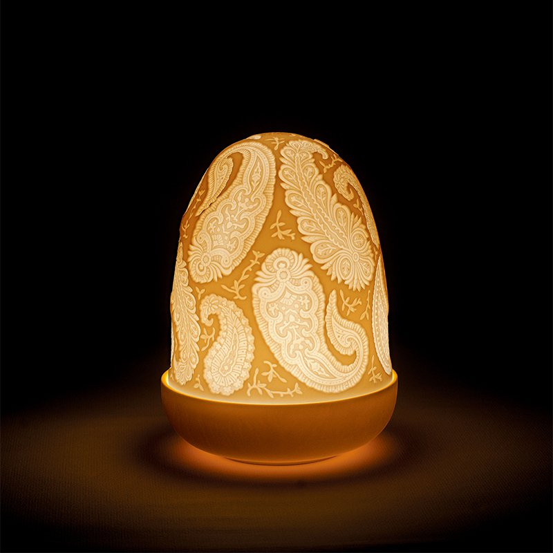 つやのないポーセリンで仕上げられており、透け感のある大きなドームの形をしたシェードをかぶせたテーブルランプは明かりをつけると、描かれた柄が浮かび上がります。