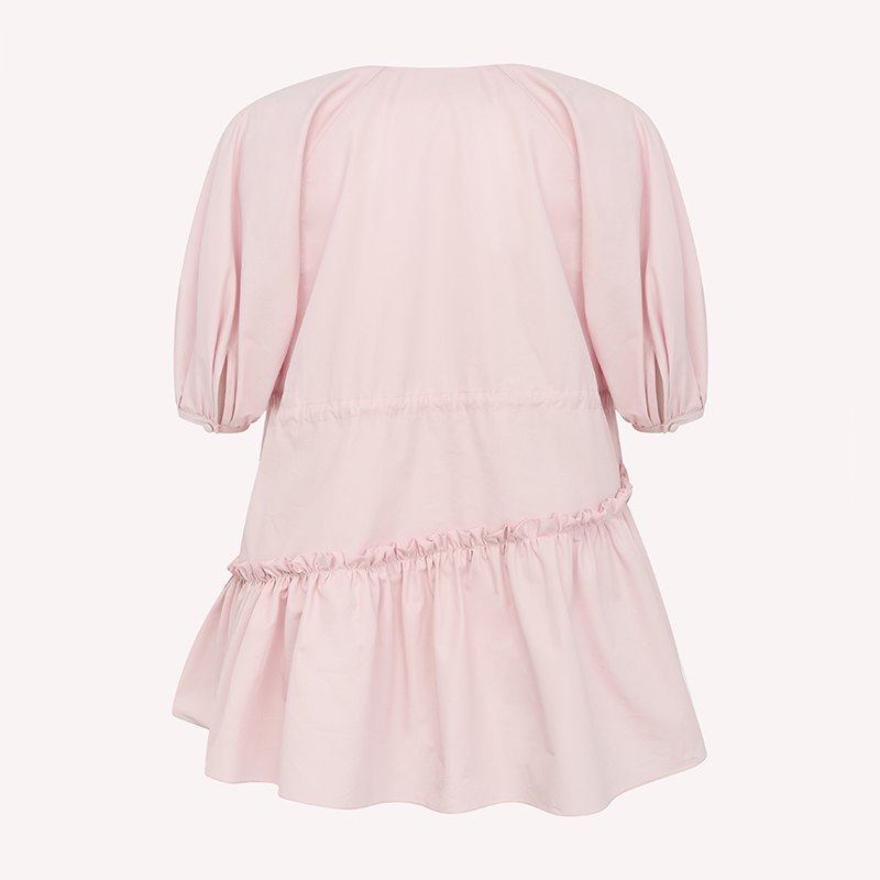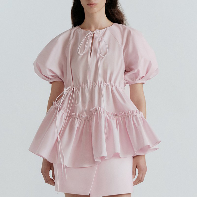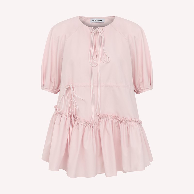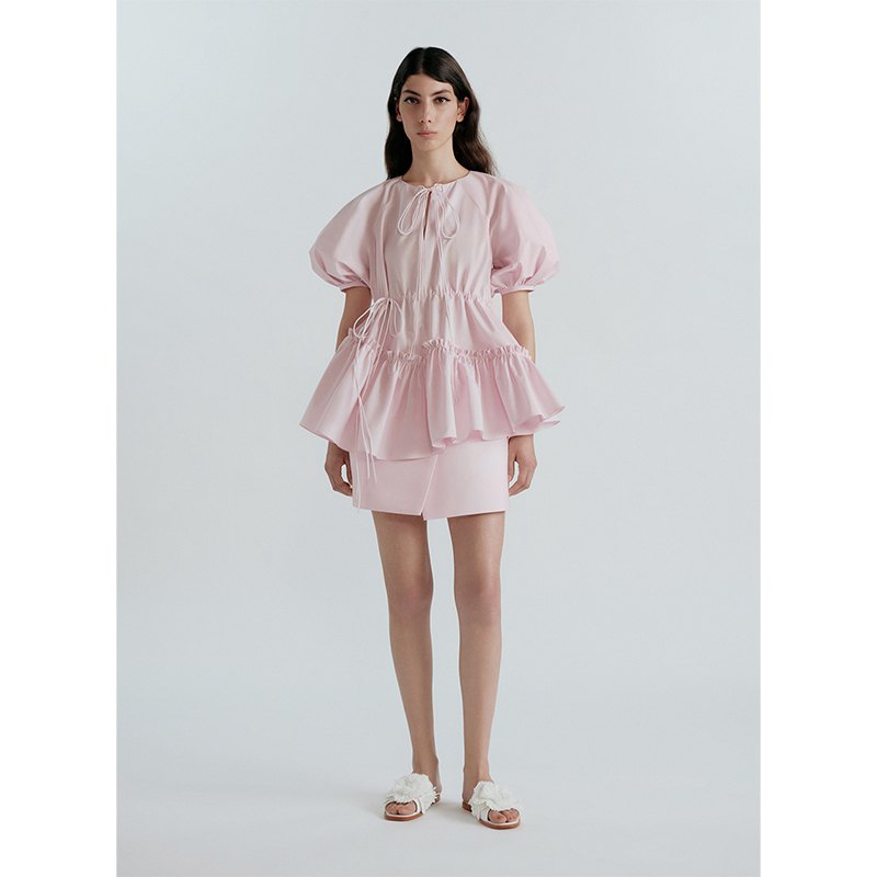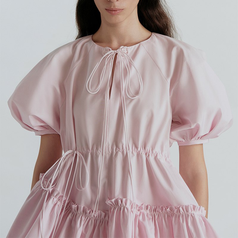 ボリュームのあるシルエットは、ネックとウエストラインで結ぶ繊細な二重のドローストリングで、コンバーチブル仕様になっています。