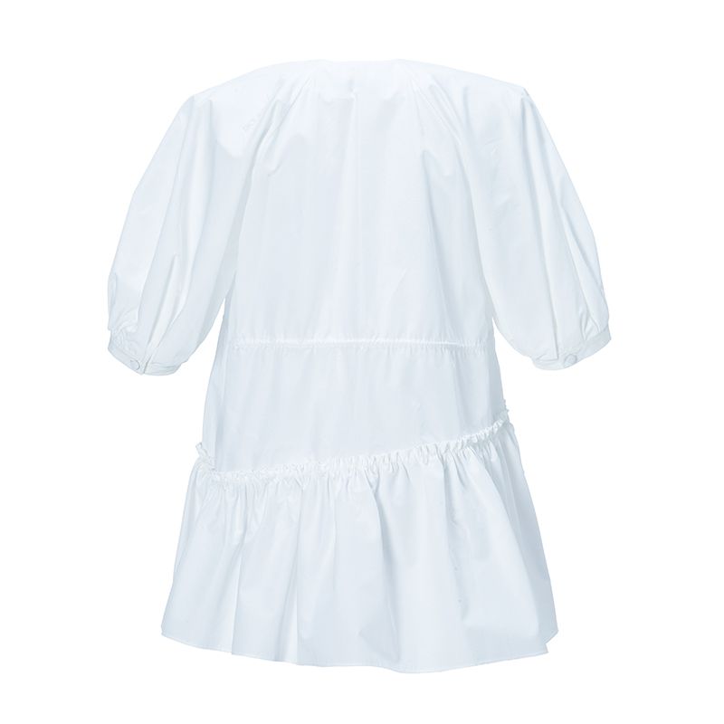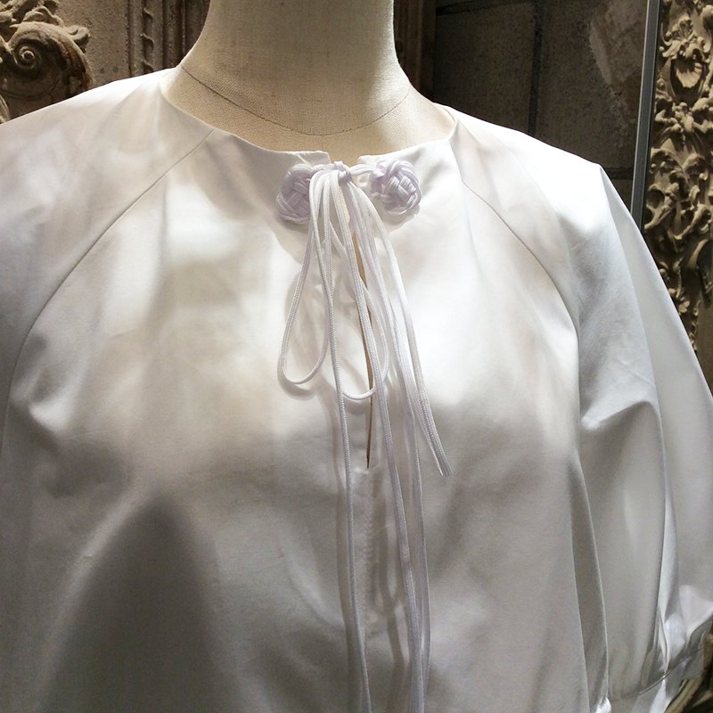 ボリュームのあるシルエットは、ネックとウエストラインで結ぶ繊細な二重のドローストリングで、コンバーチブル仕様になっています。