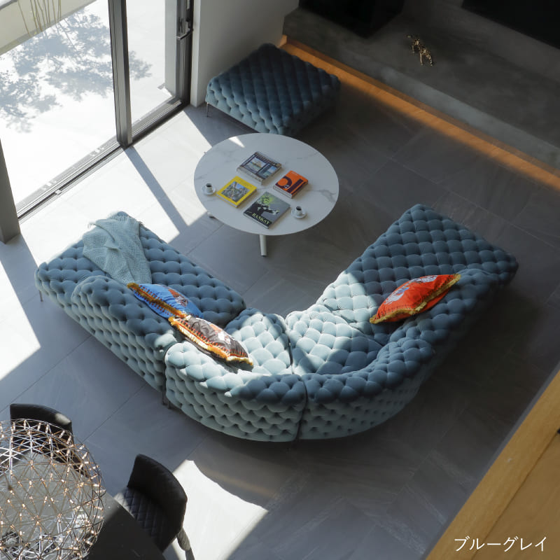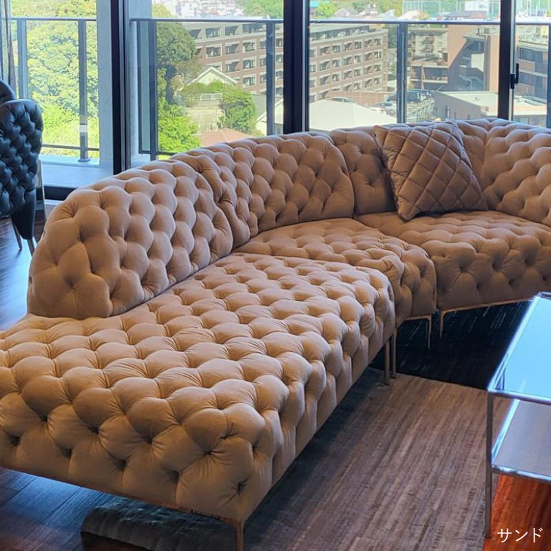 リズミカルにステッチ(タフティング加工)を施したクラシックなチェスターフィールド調のソファを、モダンにアレンジしたデザインです。