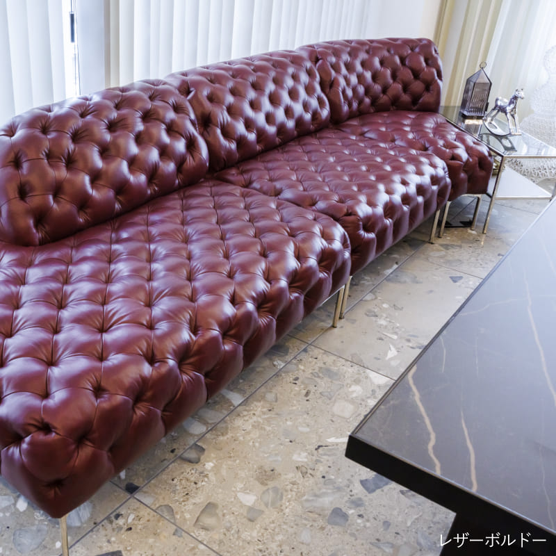 リズミカルにステッチ(タフティング加工)を施したクラシックなチェスターフィールド調のソファを、モダンにアレンジしたデザインです。