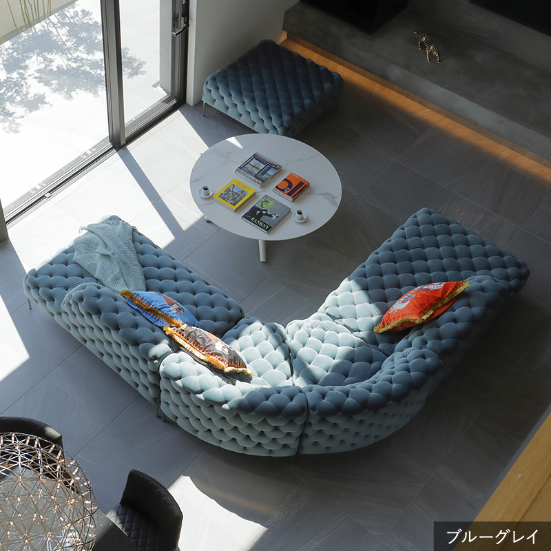 リズミカルにステッチ(タフティング加工)を施したクラシックなチェスターフィールド調のソファを、モダンにアレンジしたデザインです。