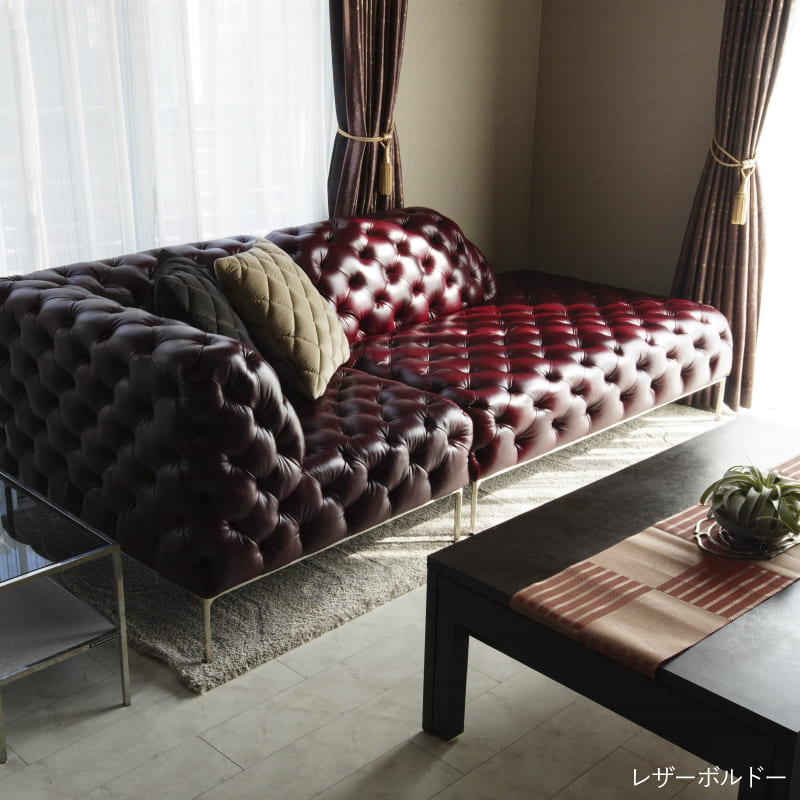 リズミカルにステッチ(タフティング加工)を施したクラシックなチェスターフィールド調のソファを、モダンにアレンジしたデザインです。