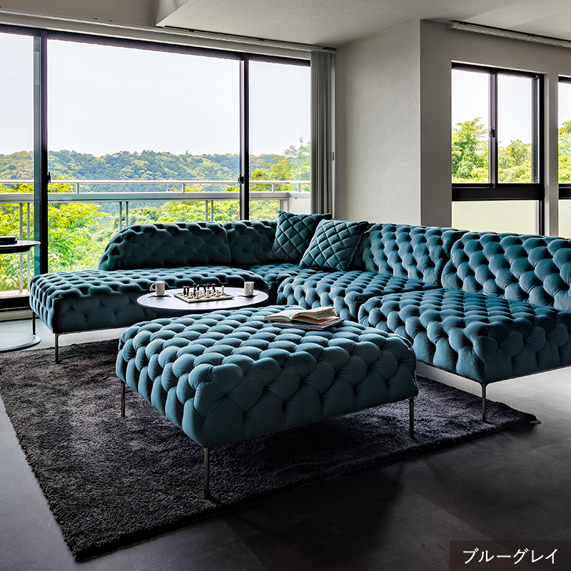 リズミカルにステッチ(タフティング加工)を施したクラシックなチェスターフィールド調のソファを、モダンにアレンジしたデザインです。
