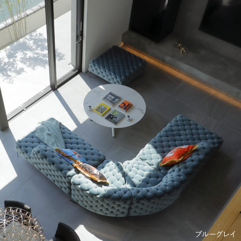 リズミカルにステッチ(タフティング加工)を施したクラシックなチェスターフィールド調のソファを、モダンにアレンジしたデザインです。