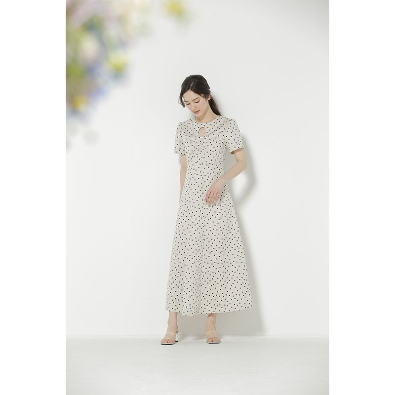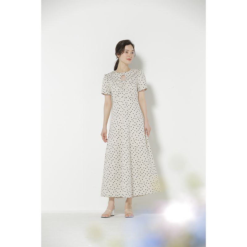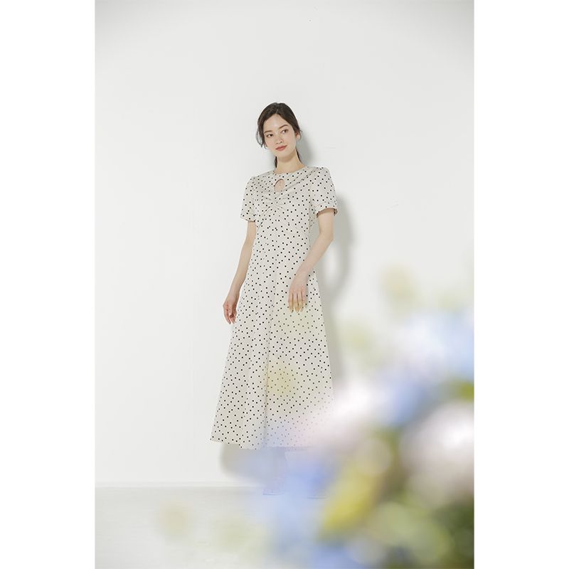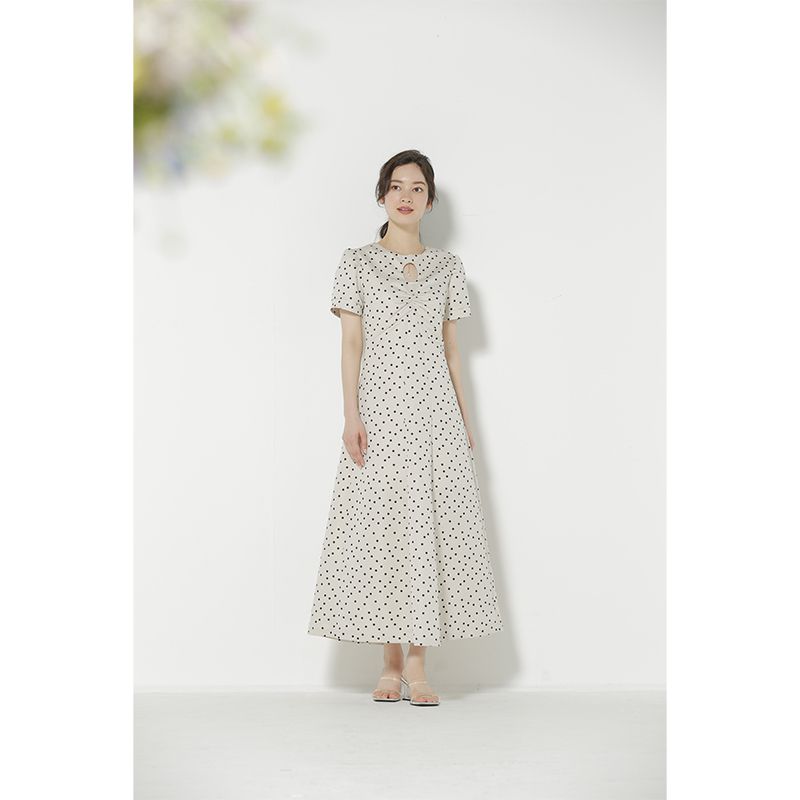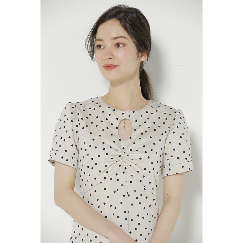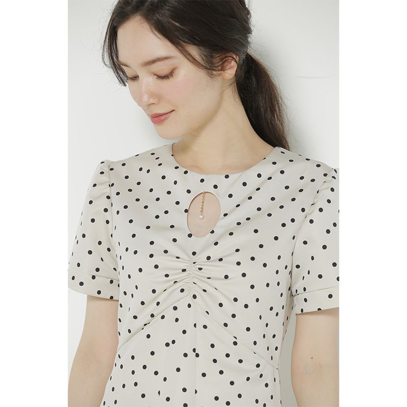 胸元のホールに揺れるパールをあしらったドットワンピース。