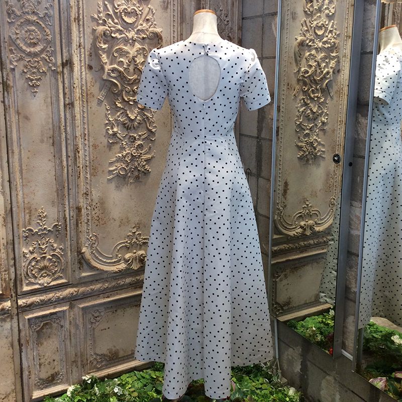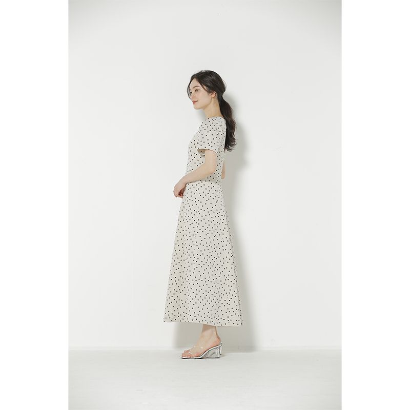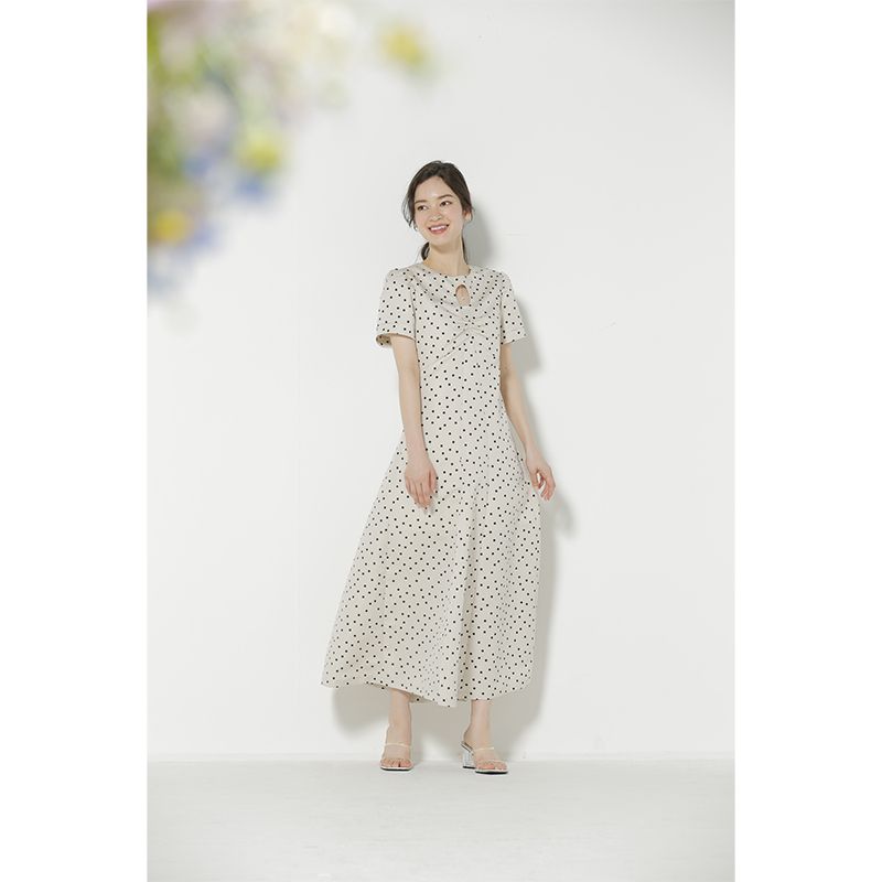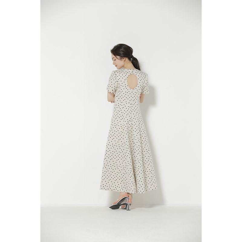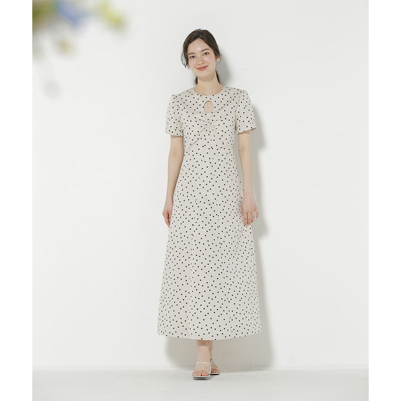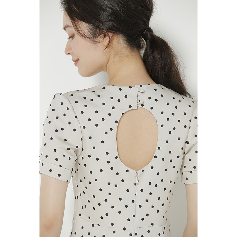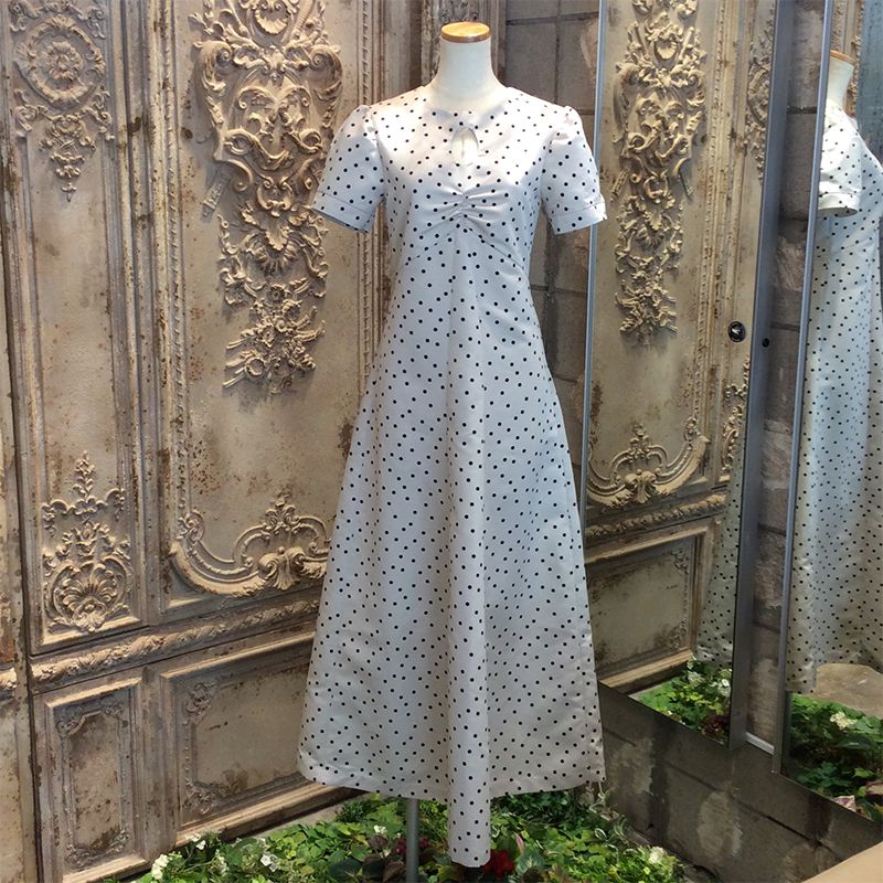 胸元のホールに揺れるパールをあしらったドットワンピース。