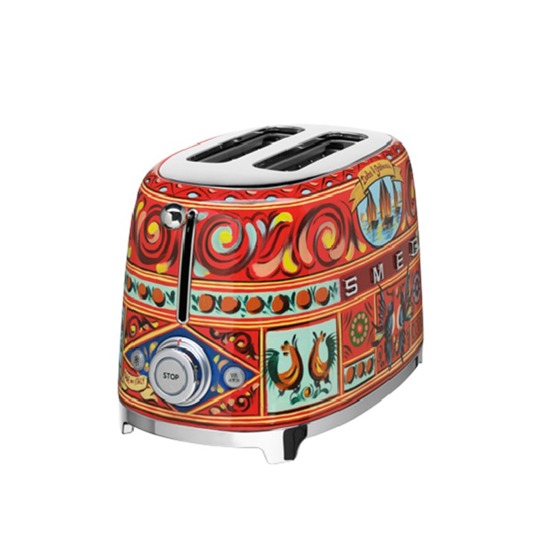 トースター全体にシチリアらしい伝統的なモチーフを表現。テラコッタの壺や、雄大なおんどり、地中海の地平線に向かって航行するヨットなどが、シチリア文化のシンボルにもなった「荷馬車」のように美しく描かれています。