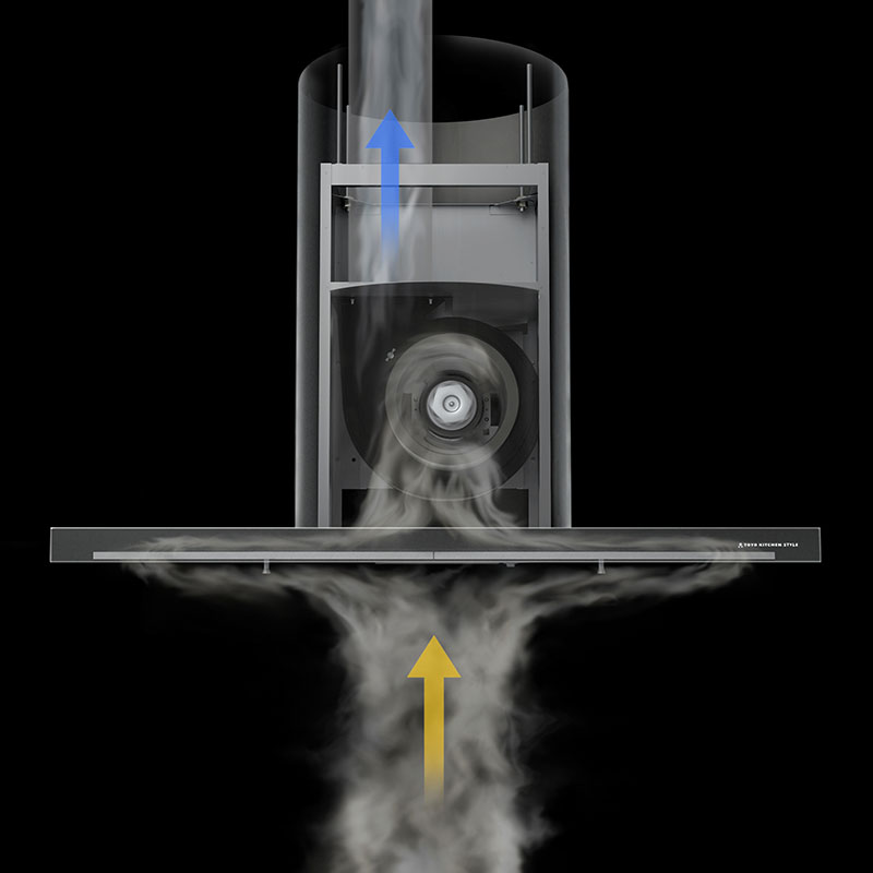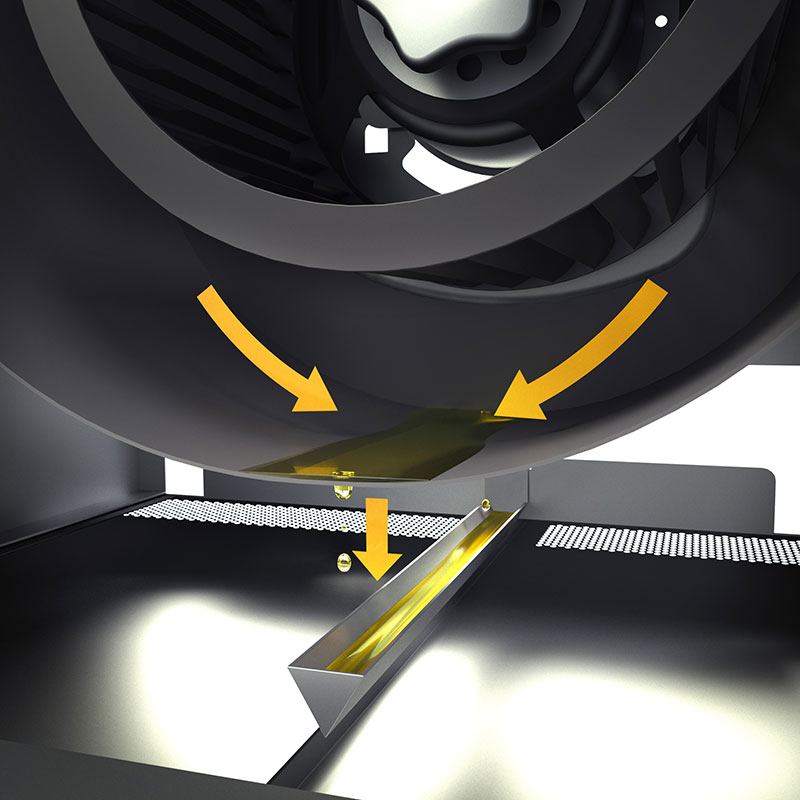 整流板によりレンジフードの吸気風力を加速させ、油煙捕集率をアップ。僅かな熱、油煙でもしっかりと捕集します。シロッコファンの遠心力により、油煙の油脂分を分離して排出し、油脂はオイルトレーに溜まります。