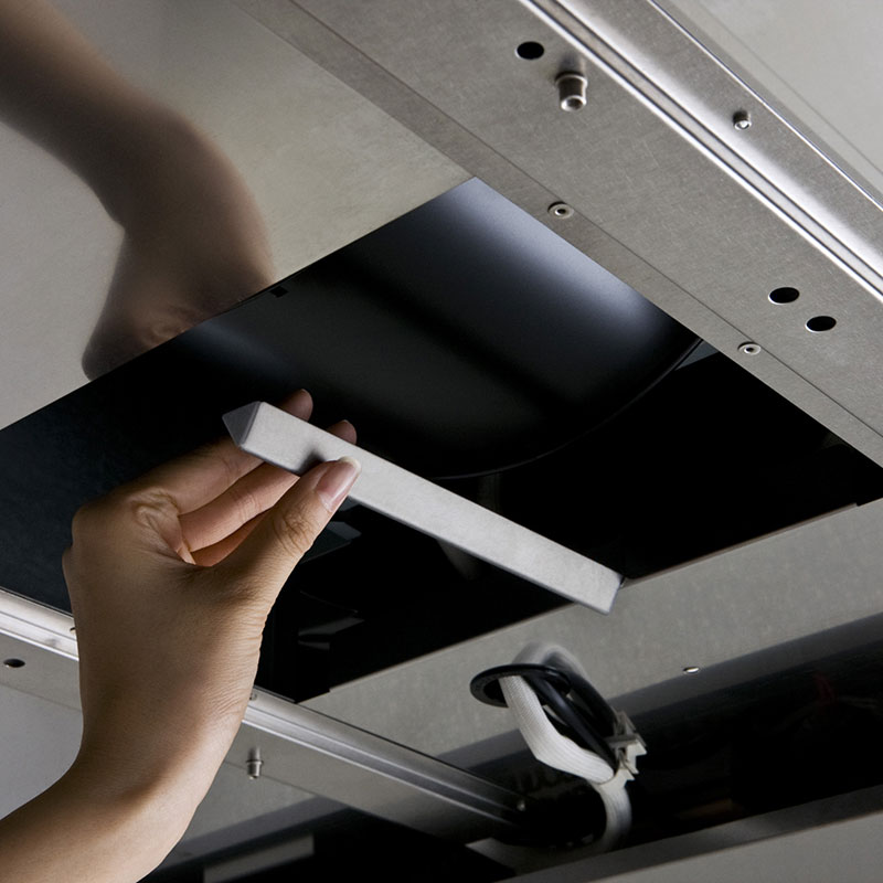 空気の流れをスムースにし、さらにパワフルな吸引力の高捕集型レンジフードを実現しました。また、加熱機器との連動でON/OFFを自動化。ファンの付け忘れの防止に。