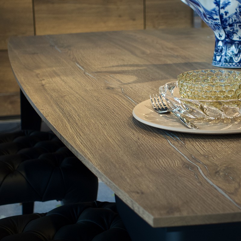 オーク材の荒々しい木目と、ラフな質感をそのままデザインにしたHPL天板。