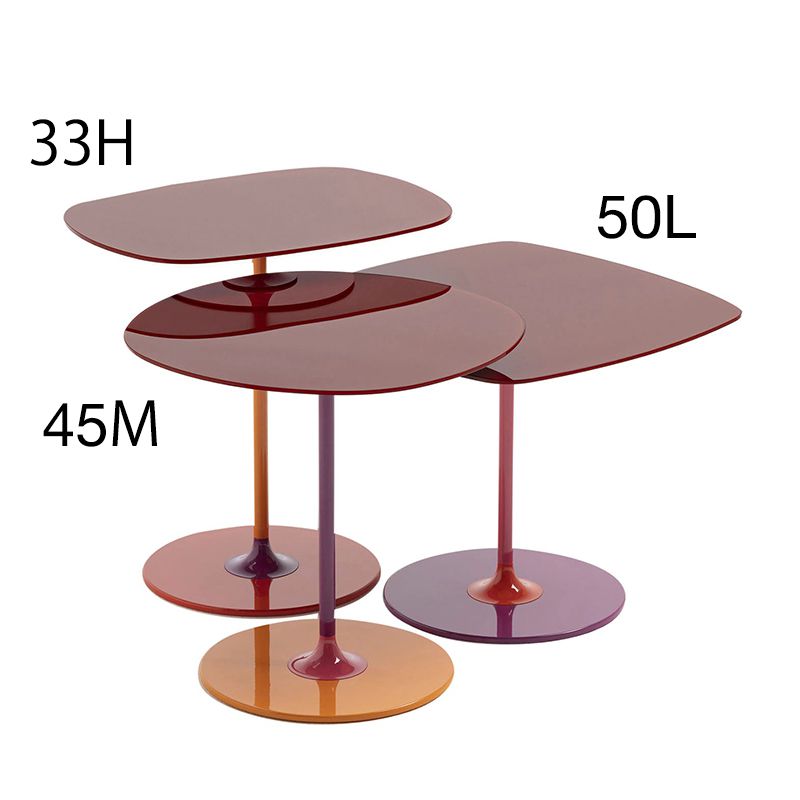 ファッション性の高いボルドー、クラシックなシーブルー、エレガントなロンドンスモークグレーなど、艷やかで光沢のあるガラステーブルとフレーム、ベースは同じ色調の中で対象的な組み合わせになっています。
