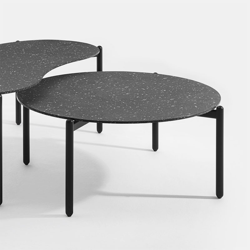 テーブルトップの丸や豆状のかたちや、脚部のブラック仕上げのスチールレッグは、ソファの「ルナム」シリーズと共通のモチーフです。「ルナム」シリーズとコーディネートして、団らんの場を作り上げるのに最適です。