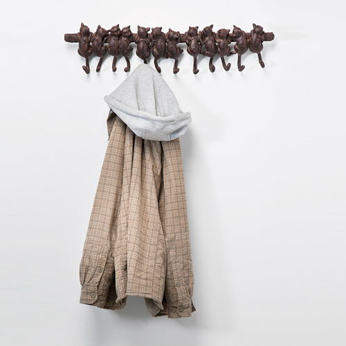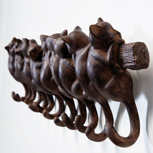 壁にしがみついた猫がモチーフになったコートラック。くるりと鍵型に曲がったしっぽの部分がフックになっています。