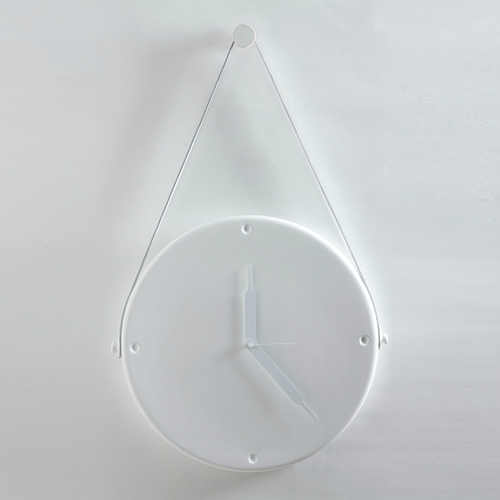 ホワイトレザーのストラップ付きセラミック製掛け時計。装飾プレートを思わせるレザーストラップがついた形状は、デコラティブとシンプルモダンなテイストをミックスさせています。ハイメ・アジョンのデザイン。