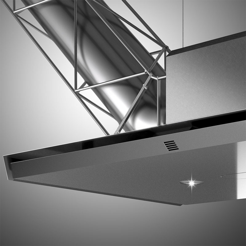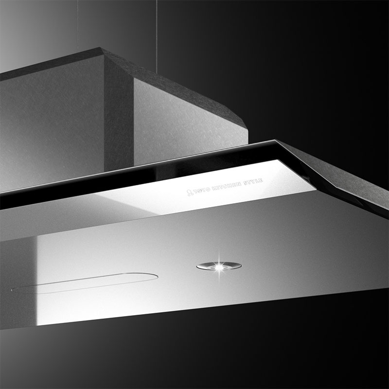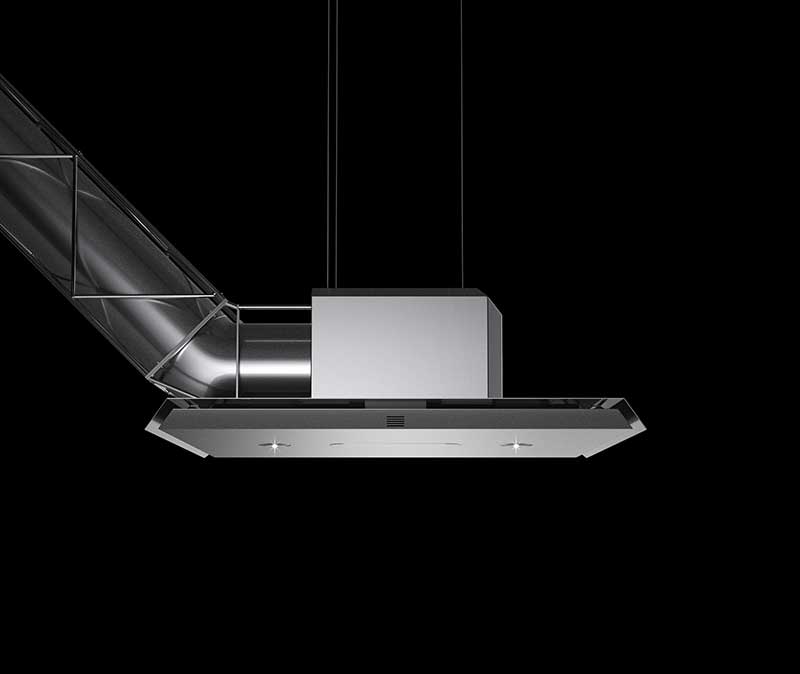 トラスフレームを備えた存在感溢れる薄型レンジフード。